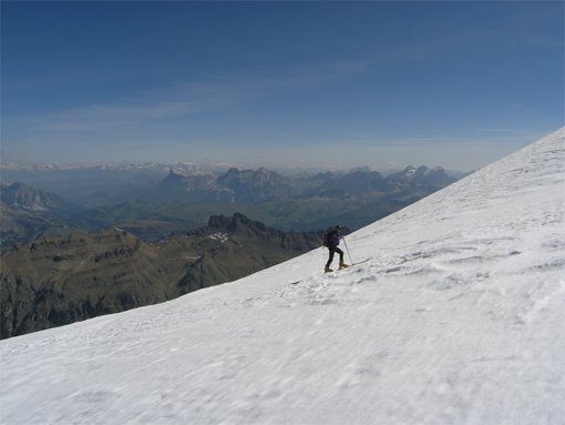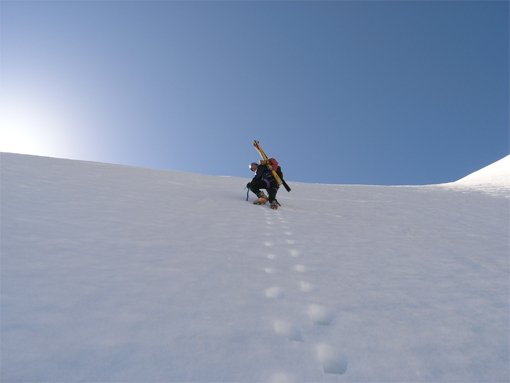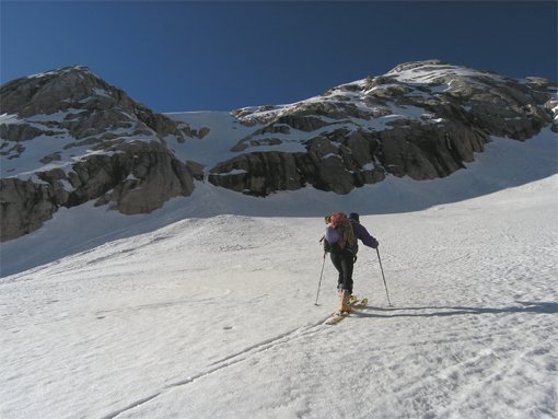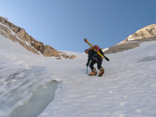 Vom Einstieg über die Engstelle (je nach Schnee bzw. Eis bis zu 50°) hinauf in ein flacheres Becken (35°). Ab dort immer gerade (oben 45°) hinauf bis zum Ausstieg auf dem Rücken (Material kann hier liegengelassen werden). Vom Ausstieg flach, leicht linkshaltend zum höchsten Punkt.