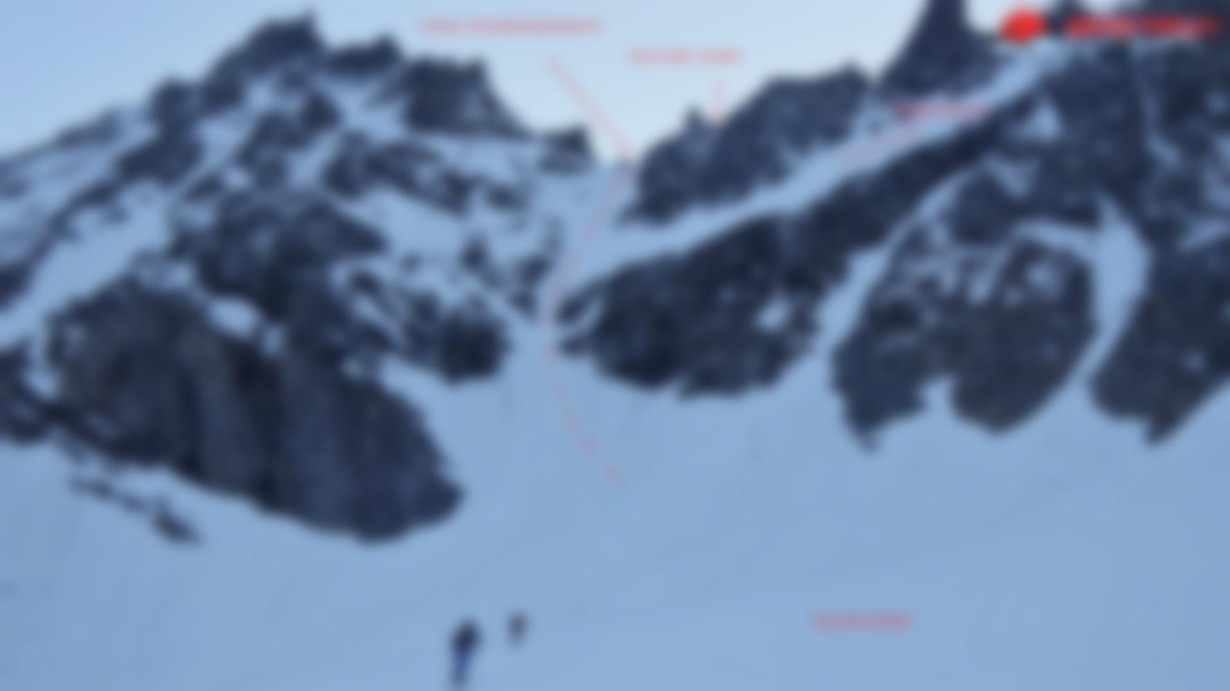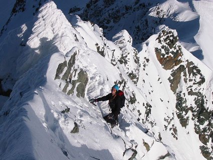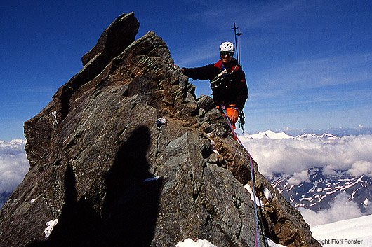 Danach über den NW-Grat (140 m langer Gratanstieg, der bei Schneelage nicht zu unterschätzen ist) zum Gipfel.