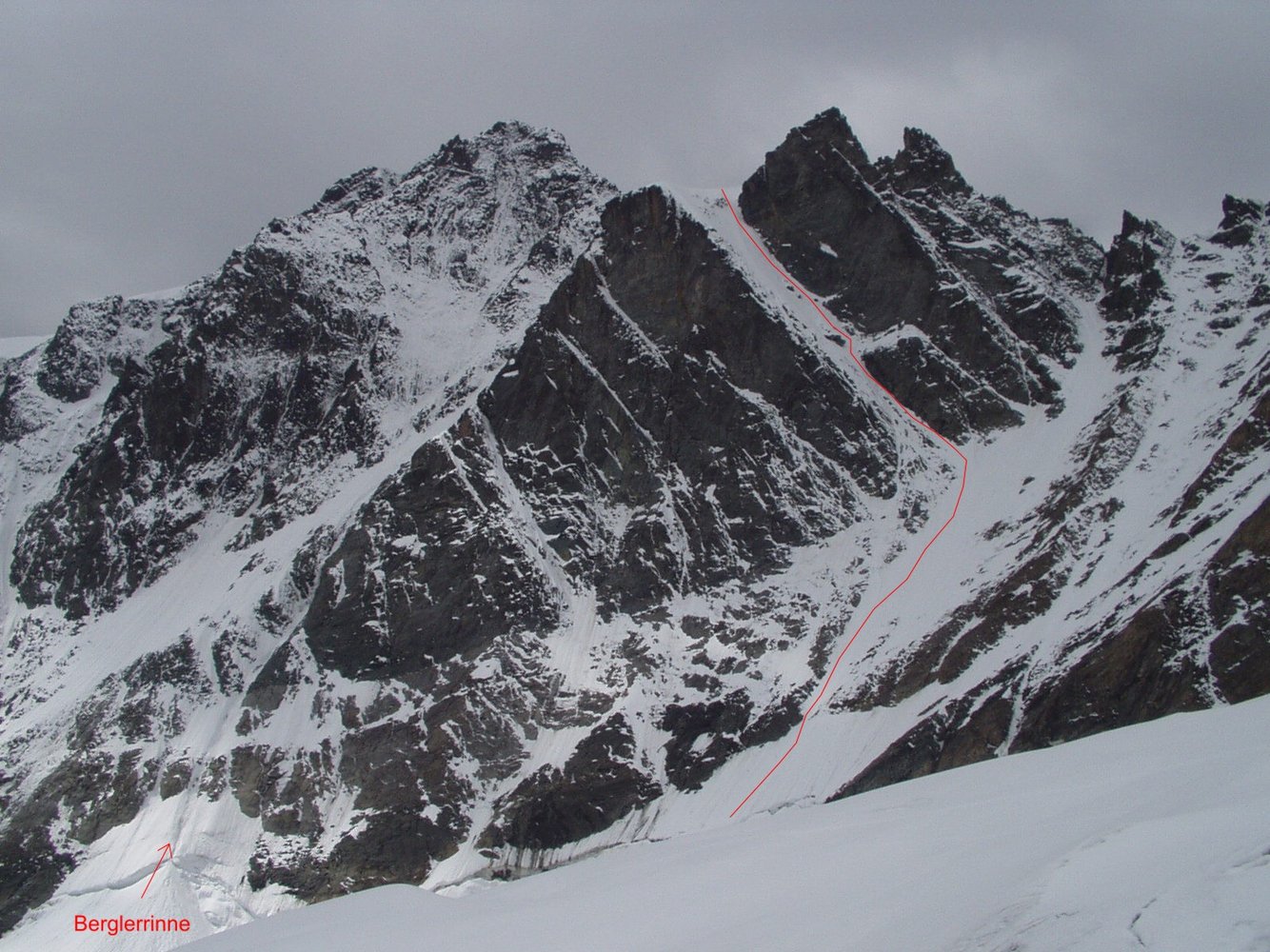Von der Biwakschachtel dem Grat etwas folgen und dann links zu den Einstiegen der Nordwandrouten queren, die Mayerlrampe ist ueber eine ca. 250 m 40° - 50° Firn/Eiswand (Einstiegswand) rechts von der Berglerrinne zu erreichen. Nach der Einstiegswand (hier erhöhte Steinschlaggefahr) , die nach der Randkluft mit zunehmender Höhe steiler wird, gelangt man zur eigentlichen Rampe. Nun folgen ein paar super Seillängen im besten Blankeis (bis 70°) hin auf die "Grögerschneid" 3660 m.