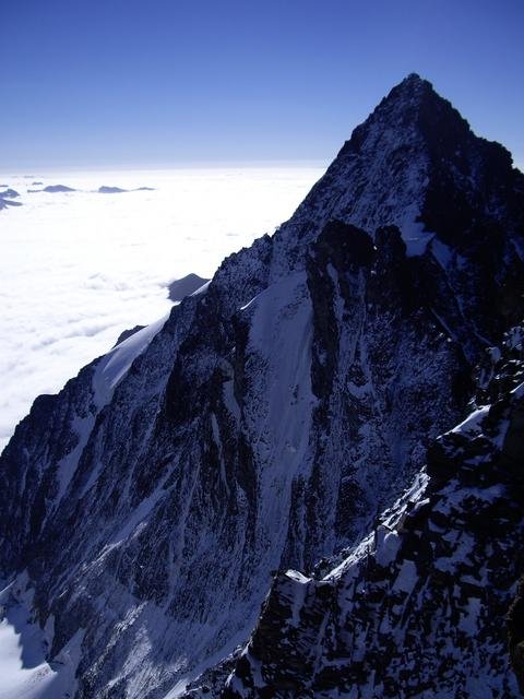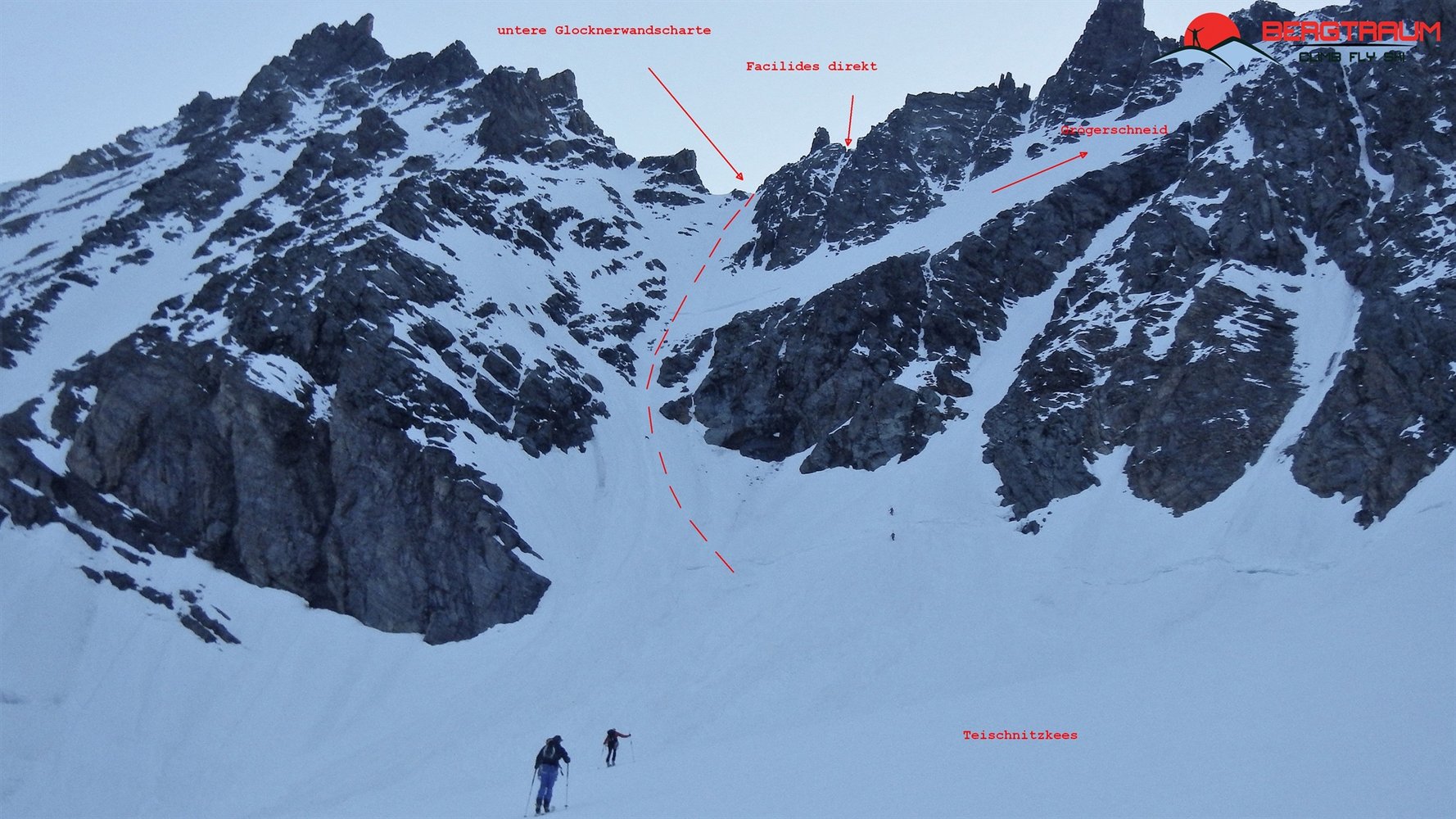 Man kann auch von der Grögerschneid über die "Grögerrinne" 40 - 45° und danach über das Teischnitzkees zur Stüdlhütte absteigen - also von der Grögerschneid über steile Firnfelder nach Süden hinunter.