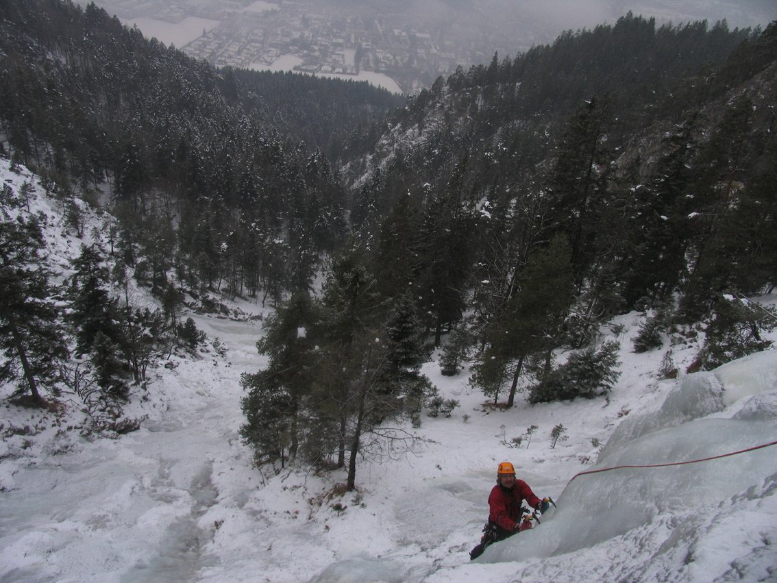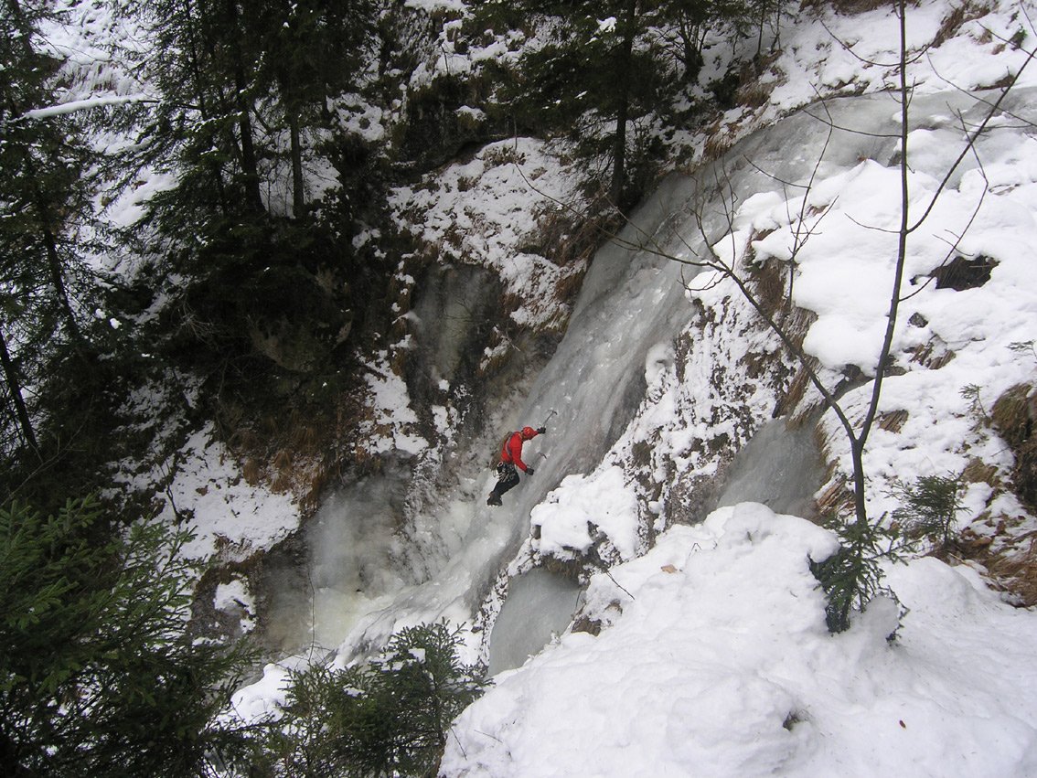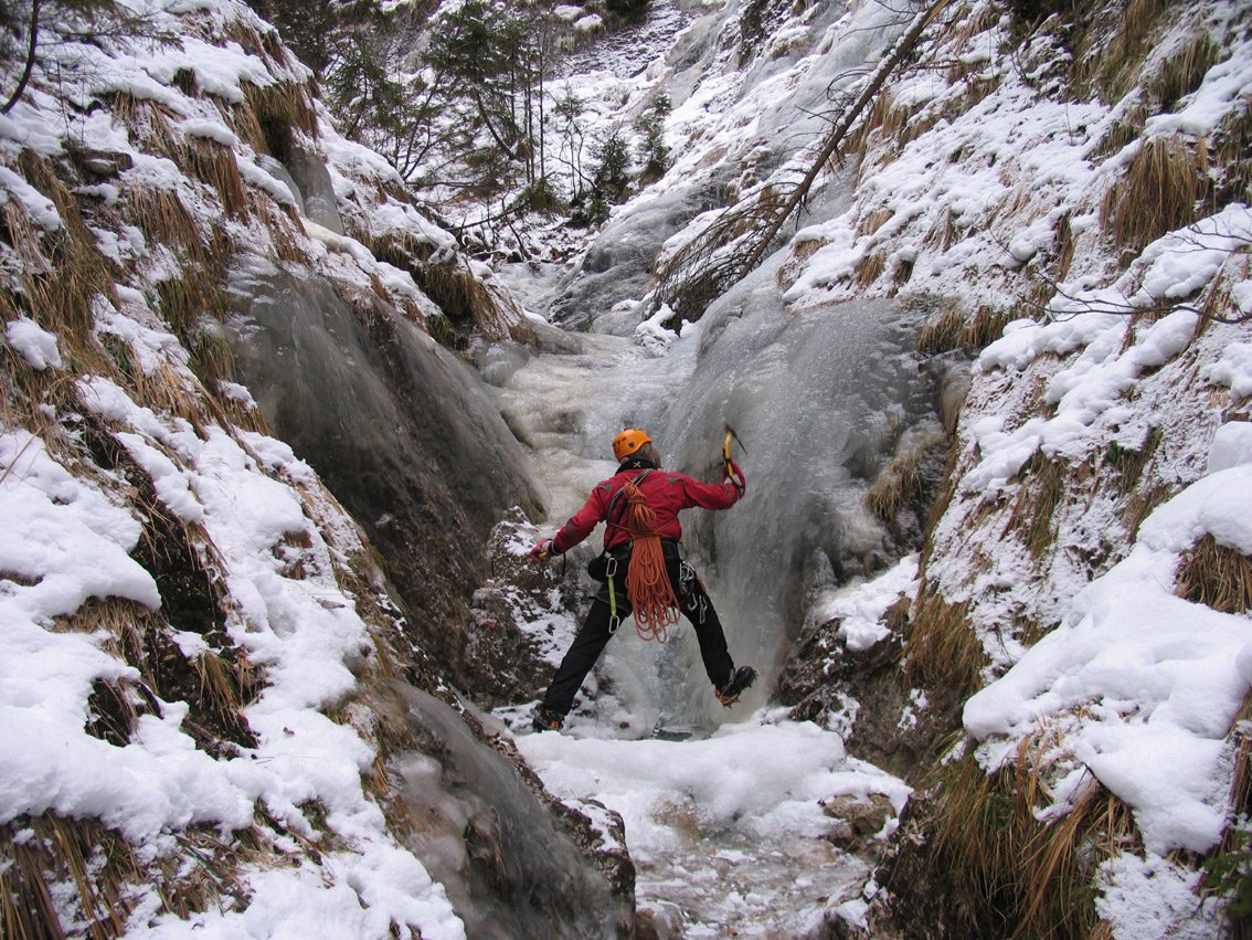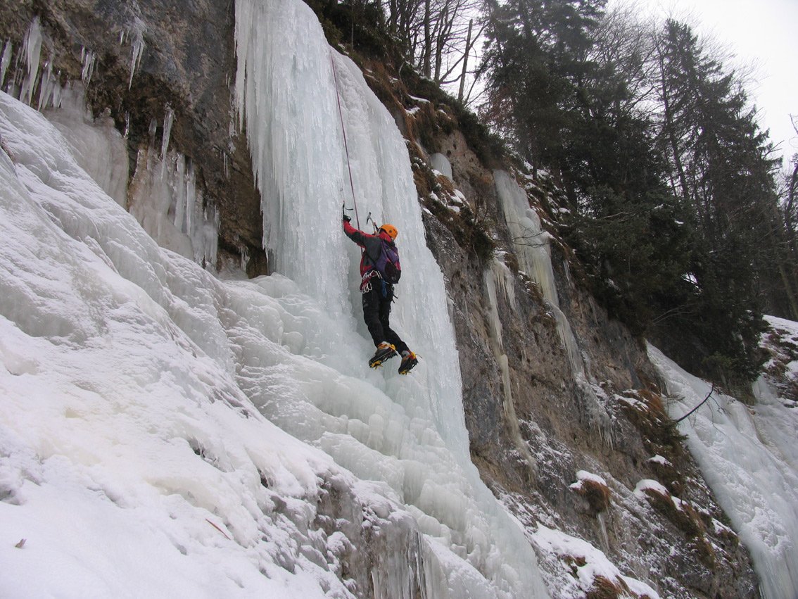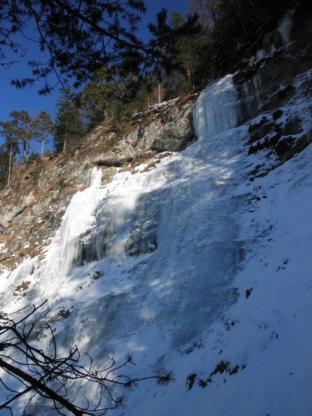 Schöner Eisfall direkt im Nahbereich von Kufstein. Der Fall ist im Grunde leicht (WI 2) und hat oben einen schweren direkten Ausstieg (WI 4/4+), wenn man rechts aussteigt ist es genau so schwer wie unten. Der Fall ist durchaus für Anfänger geeignet (siehe Bemerkung) und wird auch für Kurse genutzt.