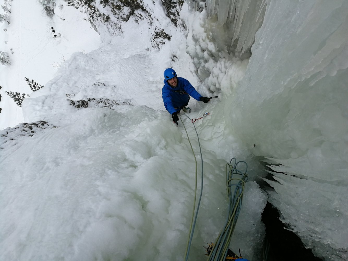 1.SL 45 m kurze Steilstufe WI4 danach legt sich der Fall etwas zurück. Stand bei Nische rechts der Säule.