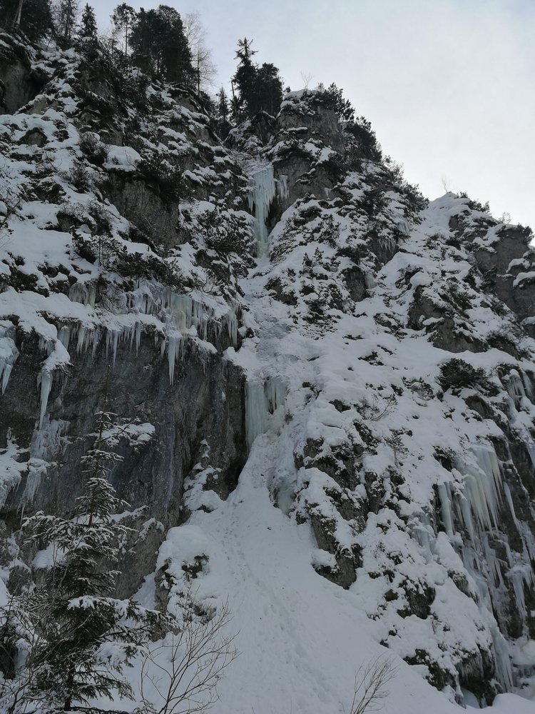 2. Sl 50 m über Säule empor und je nach Eisverhältnissen hoch und Stand bei Baum orographisch rechts.