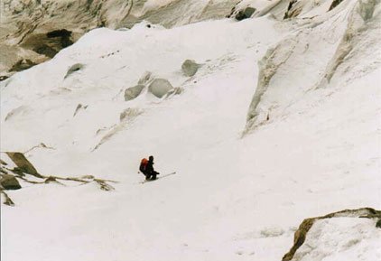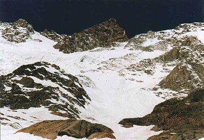 Bei Ausstieg Grenzsattel (4452 m): Von dort auf den Grenzgletscher hinunter - bis zur Randspalte sind es etwa 3 Seillängen (150 Abseilmeter), ca. 45-50° (also ca. 75hm) steil (evtl. blank !). Abseilen mit Eisschraubentrick (oder Eissanduhr). Randspalte ( Abseilenderweise überwinden, ca. 5 Meter hoch). Sollte es dort Trittfirnverhältnisse haben und man muss nicht abseilen, ist es besser, der Randspalte nach rechts oder links (ca. 100m) auszuweichen, dort ist sie wesentlich kleiner und wahrscheinlich besser überwindbar.