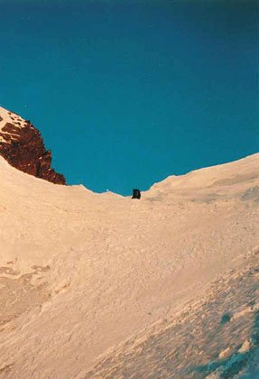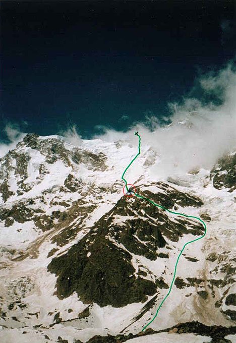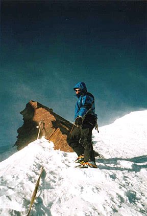 Silbersattel auf 4515m sehr windanfällig. Ab hier Materialdepot und weitere 80hm über gut versicherte Felsen zum Vor-Gipfel(4634m). Stellen I bis II aber durchgehend mit Seilen und Bohrhaken versichert. Zeit ab Sattel bis Vor-Gipfel 0,5h.