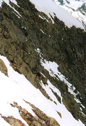 Alternativ ist es bestimmt auch nicht schlecht, links (südlich) vom Grenzsattel und der Zumsteinspitze im Colle Gnifetti aus der Wand auszusteigen. Die Querung am Ende der Wand wird dadurch länger. Allerdings erspart man sich dann die 3 Seillängen Steilabstieg und ist quasi direkt bei der Capanna Margherita auf der Signalkuppe. Auch die Abfahrt Richtung Alagna oder Gressoney (beides Italien) wird dadurch ermöglicht. Um das vom Grenzsattel aus zu machen muss man die Zumsteinspitze überschreiten.