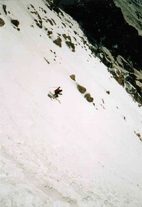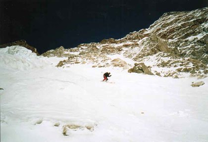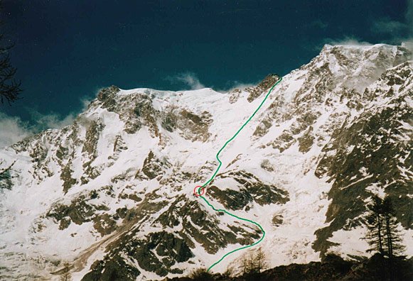 Bei der Gaststätte in Nähe der Sesselbahnbergstation kann nachgefragt werden ob es Begehungen oder Befahrungen der Wand gab in letzter Zeit. Wirtin ist nett, gibt gerne Auskunft und spricht auch deutsch, besitzt ein Fernglas. Die Seilbahnstation verkürzt den Zustieg gegen 8 SFR um 1,5 h und fährt ab 9 Uhr morgens. Die Wand selbst weist technisch keine großen Schwierigkeiten auf. Das Problem sind eher die Verhältnisse und die damit verbundene Lawinengefahr. Konditionell SEHR anspruchsvoll. Evtl. Stein- und Eisschlag und bei nassem Schnee starke Lawinengefahr. Auch der Anstieg zur Hütte ist der Lawinengefahr ausgesetzt. Auch sollte der Anstieg zur Hütte auch gegen Mittag beendet werden (Lawinen). Größte Lawinentätigkeit zwischen 11 Uhr mittags und 15 Uhr. Beruhigung erst gegen 17 Uhr (Juni). Die Nullgradgrenze sollte unter 3000m liegen, da sonst mühsam zu steigen ist da gegen Mitternacht sonst nur ein Harschdeckel ausgebildet ist im unteren Teil des Aufstiegs. Wand wird von den Italienern häufiger gemacht. Beliebte Route für Heliskifahrer, die ab 9 Uhr unterwegs sind.