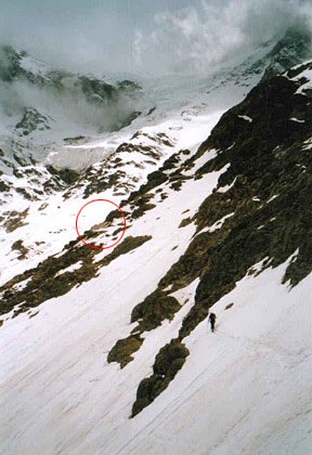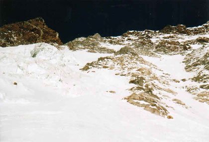 2 b: oder nach der Seraczone gerade empor und über eine schmalerwerdende Rinne (zuletzt bis 55 Grad) wieder nach links gegen den Silbersattel, wo auch Variante 2a endet. Kurz unterhalb des Silbersattels evtl. blanke Stellen. Keine Verwechtung im Ausstieg zum Silbersattel.