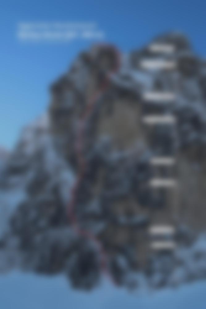 Vom Stand links haltend zu rinnenartiger Risspur, direkt links der NH der „Direkten Nordostwand“. Dort brauchbare Sicherungsmöglichkeiten. Weiter über die „Direkte Nordostwand“ bis zu Schnee-/Eisfeld nach 30 m. Hier Zwischenstand möglich an 3 NH + FK. Besser aber 15 m weiter klettern zu Stand unter steiler, gelber Wand (2 NH, dann schwer absicherbare Graskletterei, M5+).