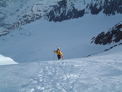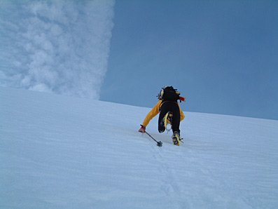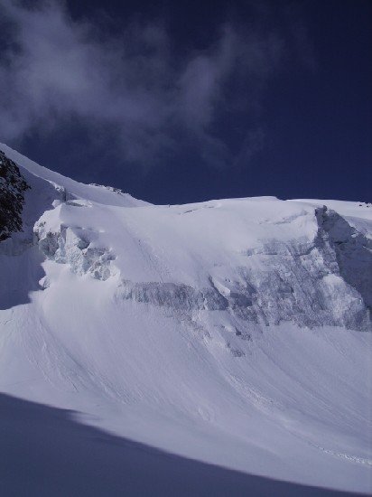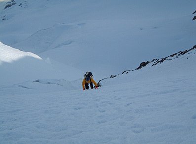 Firn bzw. Eis bis 45°/50° (bei ungünstigen Spalten auch steiler), Abstieg leichtes Gletschergelände 35°, empfehlenswert in Verbindung mit Ski, da über den Normalweg abgefahren werden kann.