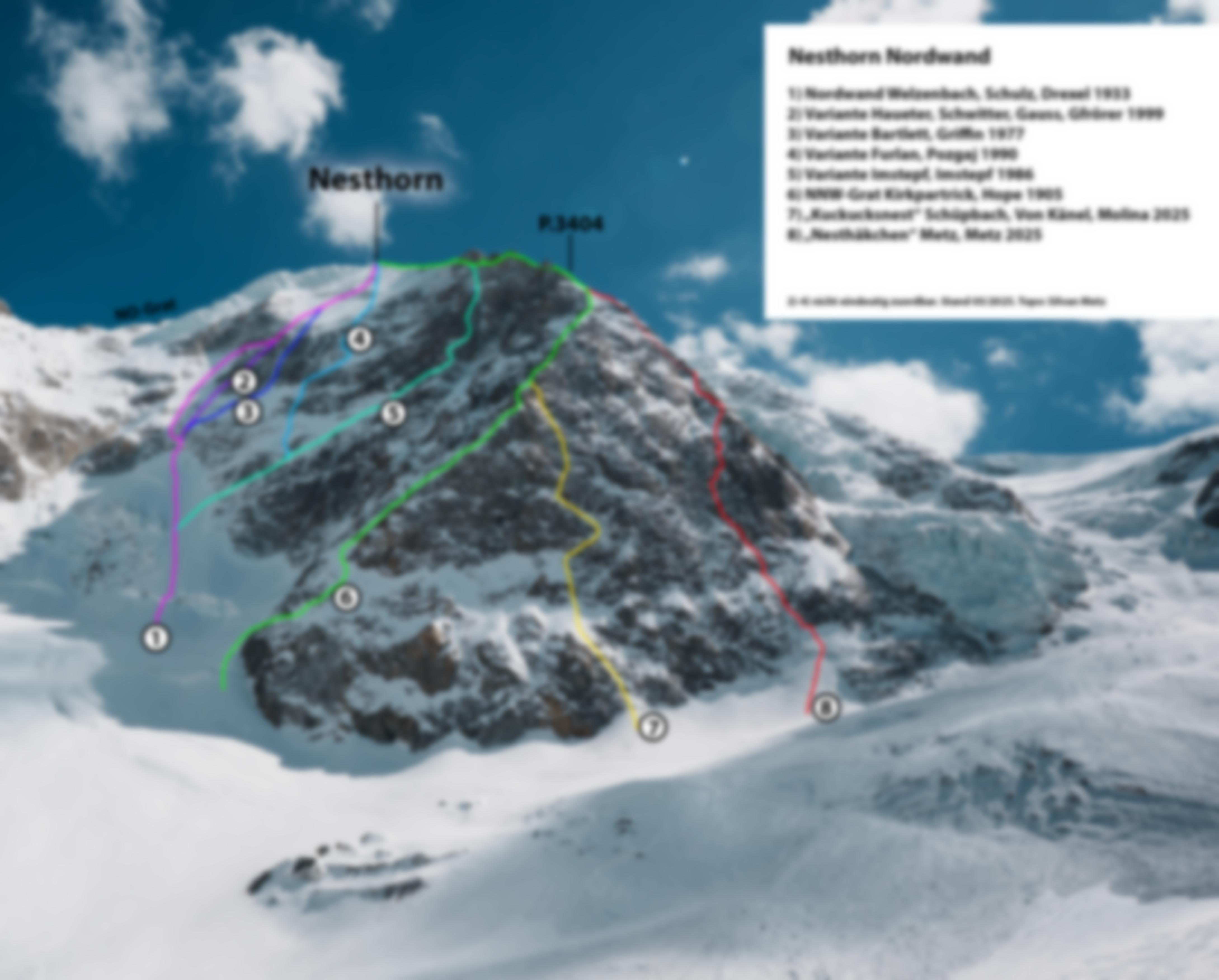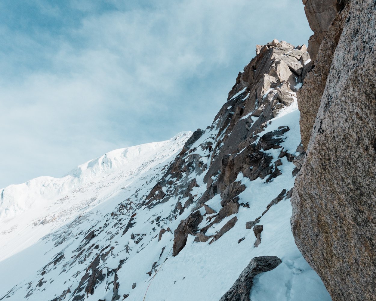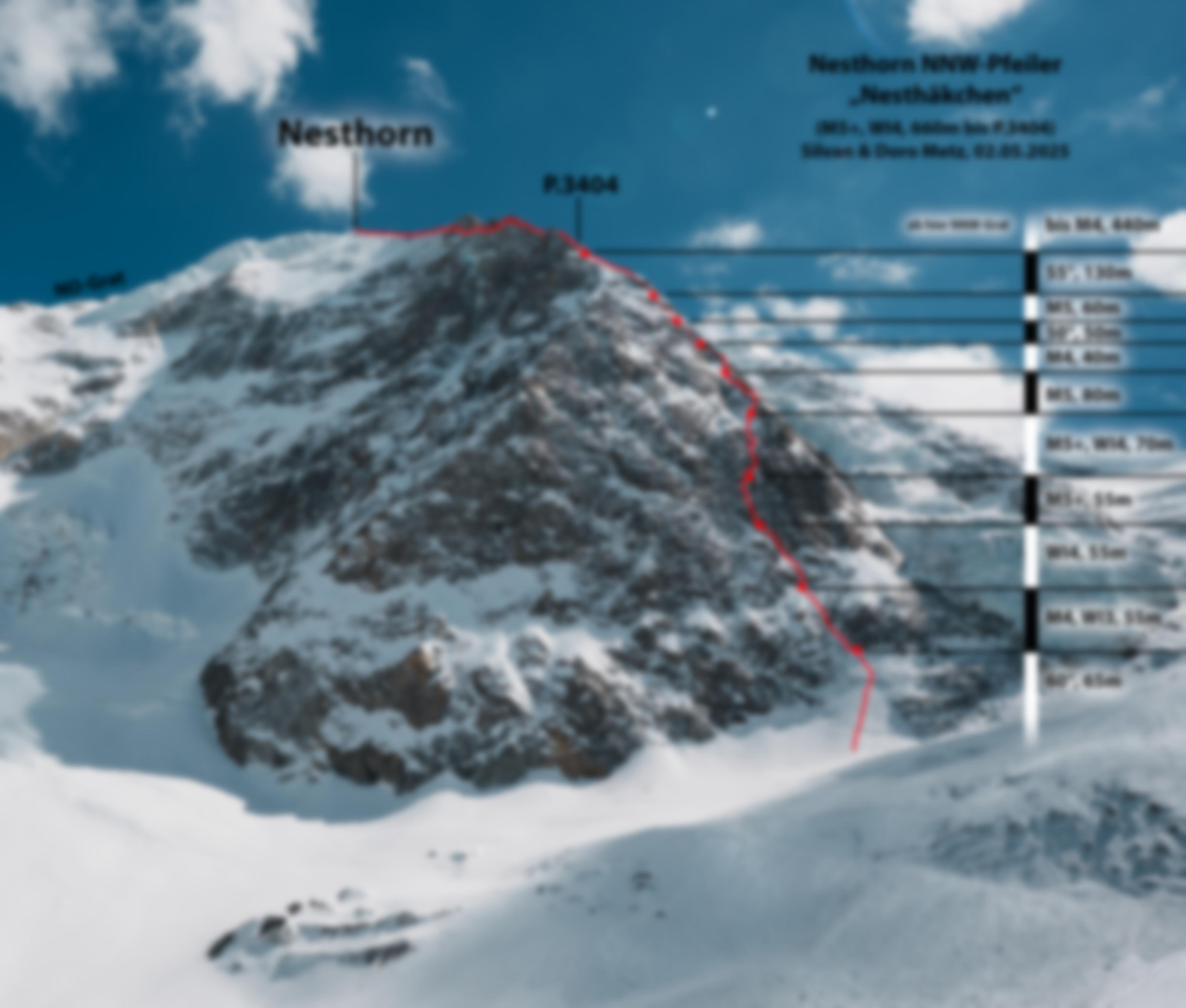 Siehe Topo. Nach dem Bergschrund folgt man zwei weitere Seillängen einem Gully, bevor man zwei steile Aufschwünge links durch Fels mit guten Klettermöglichkeiten umgeht. In der folgenden Länge quert man in den Gully zurück, hier warten bei schlechter Eisauflage kompakte, schwer absicherbare Granitplatten. Zwischenstand sinnvoll. In der nächsten Länge kann man das Gully rechts durch eine Verschneidung umgehen. Daraufhin wechselt man auf die NW-Seite (im Topo verdeckt) und folgt zwei Längen der einfachsten Linie bis zu einer Plattenzone. Im Zickzack 60m hinaufbis zu einem Schneekessel. den Schneekessel durch den linken Ausstieg auf die Pfeilerkante verlassen (60m) und flach zum P.3404, wo man auf die historische NNW-Grat Route trifft (70m).