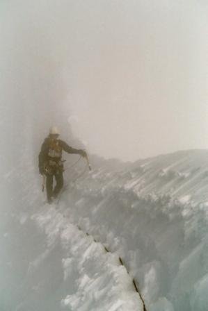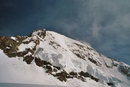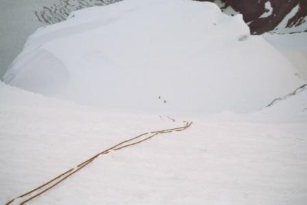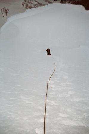 Vom Gipfel in südöstlicher Richtung einem flachen Firngrat folgen bis auf ca. 4000m Höhe. Vorsicht vor Wächtenbildung auf Firngrat. Spur lieber etwas entfernt in der Südflanke anlegen. Über ein paar Felsstufen (Stellen I bis II, teilweise Sicherungsstangen) und Firn in nun vermehrt südlicher Richtung steiler bergab. Wieder etwas flacher über einen Firnrücken zum Punkt 3887m.