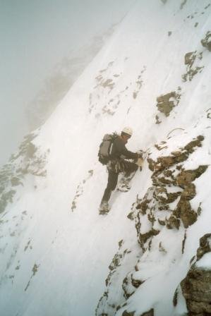 Nach Überwindung der Randspalte, die Wand im rechten Bereich hoch zum Südwestgrat.