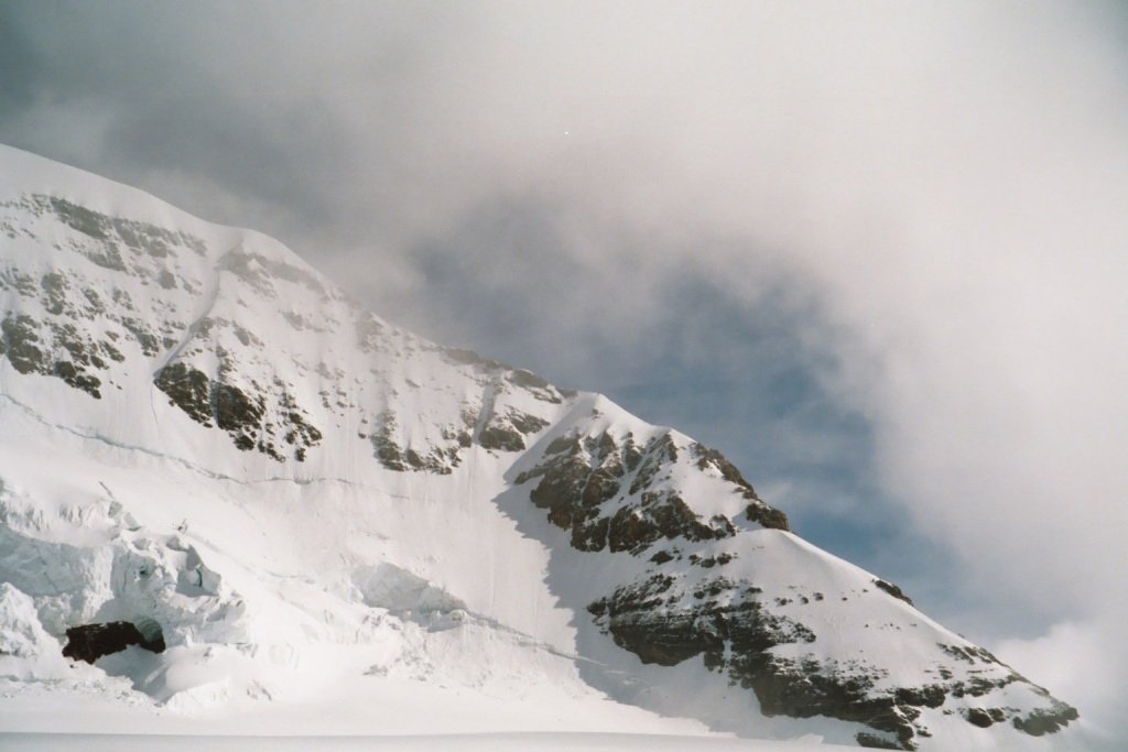 Schließlich wird nach ca. 1h das Mönchsplateau (3112) erreicht. Nun weiter über einen leichten Firn/Felsgrat bis man an das Firnfeld unterhalb des Nollen gelangt. Das Firnfeld steilt sich bis zum Nollen kontinuierlich auf. Zuletzt eine Seillänge im Eis ca. 50-60 Grad direkt unter den Nollen. Der Nollen wird meist an seiner linken Seite überstiegen, insgesamt etwa zwei Seillängen am Nollen selbst (jedoch nur die erste wirklich steil). Zuerst kurz 60 Grad, dann etwa 10m ca. 70 Grad steil, schließlich zunehmend flacher (2.Seillänge) bis man auf dem Kopf des Nollen, auf dem oberen Hängegletscher steht. Dieser wird in flach ansteigendem Gelände Richtung Südosten (Vorsicht vor Querspalten) zum Fuß der Gipfelwand erstiegen.