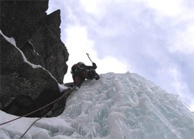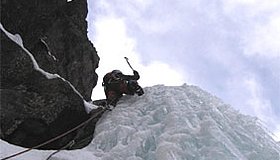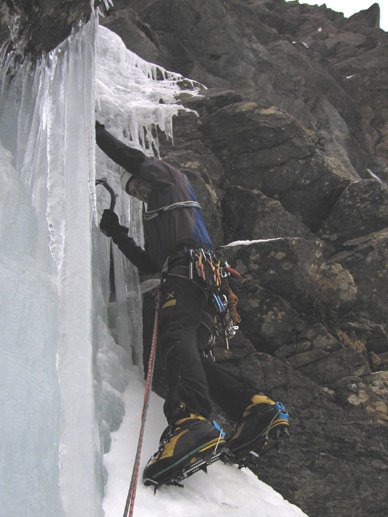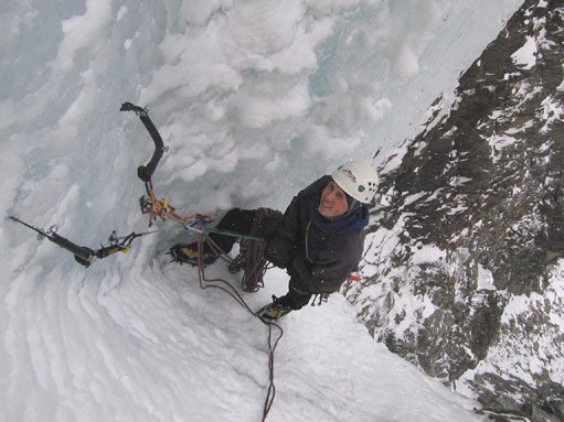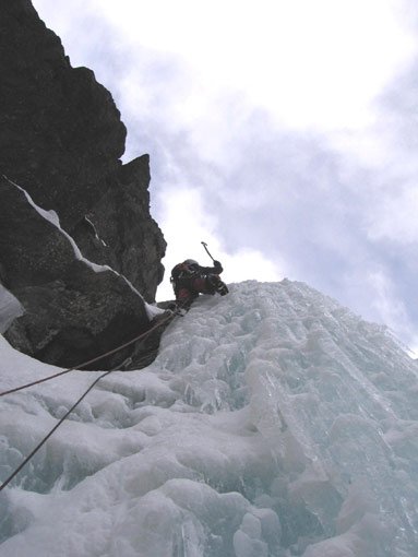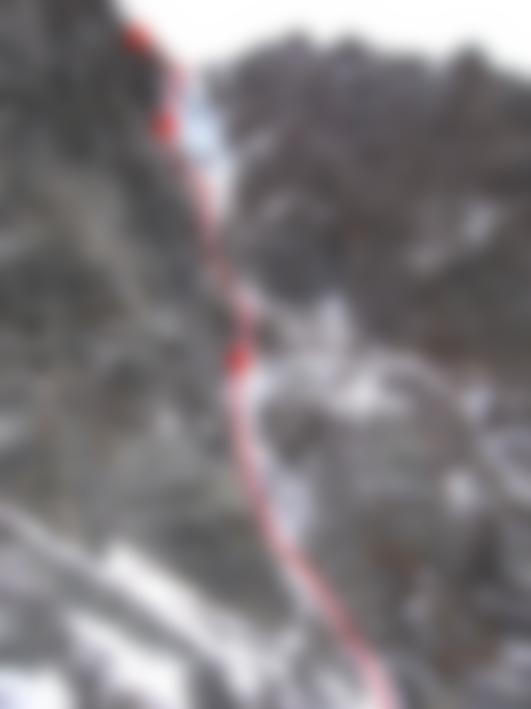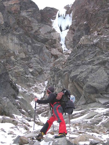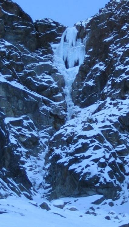 Eisgully mit steilem Finale unter der Braunschweiger Hütte. Der Fall ist wegen seiner Höhenlage (ca. 2250 m) meist schon früh im Jahr möglich.
