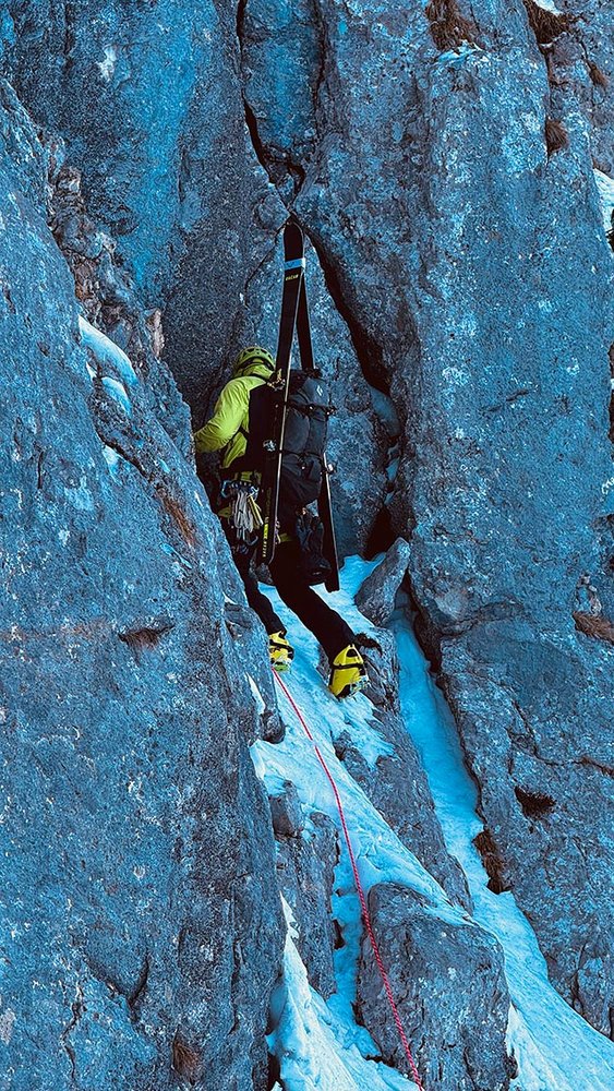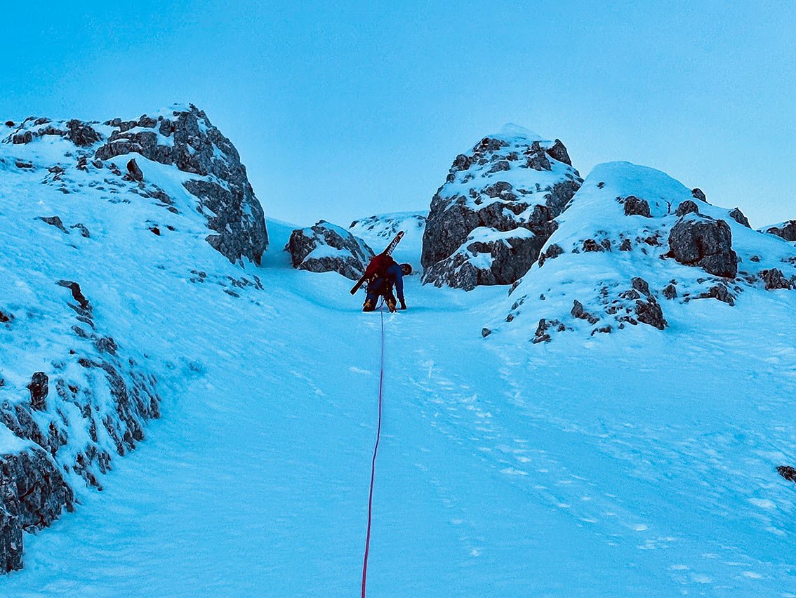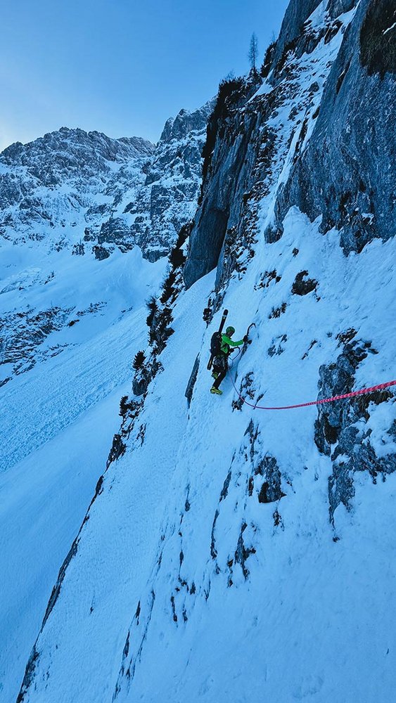 Anspruchsvolle, sehr lange, kombinierte Alpinroute.