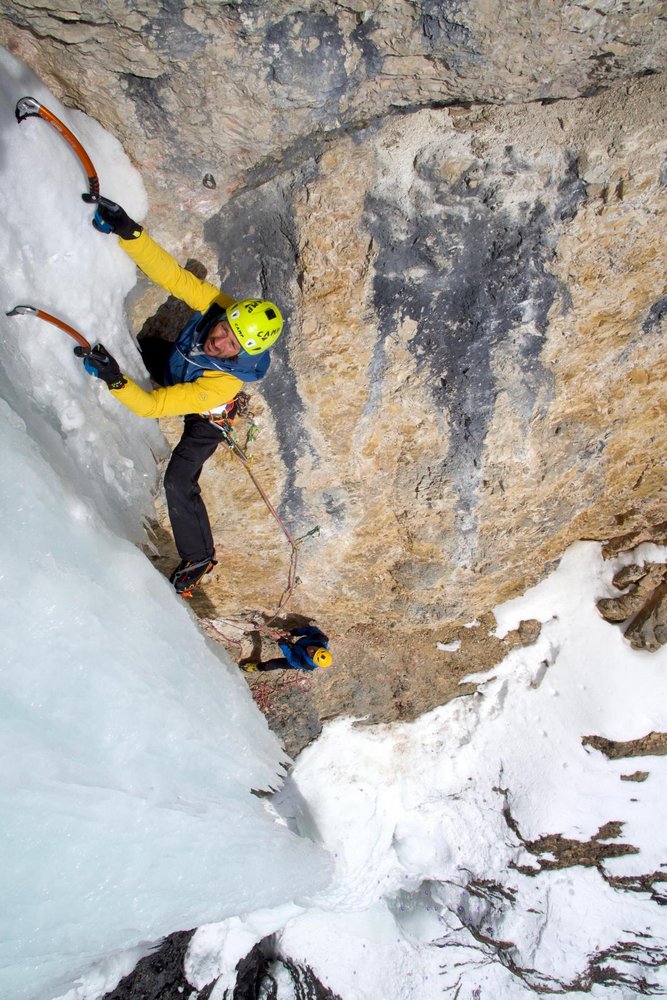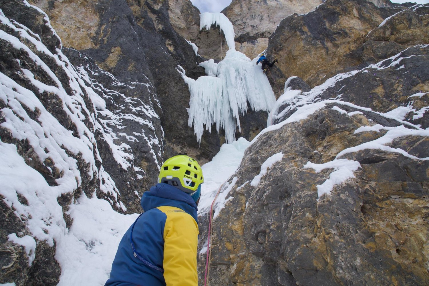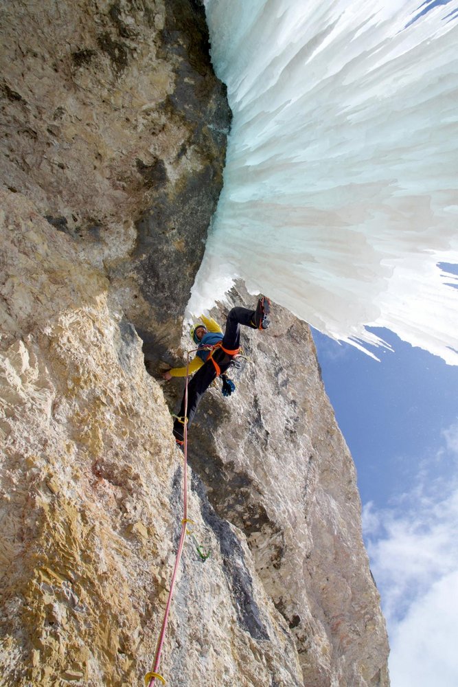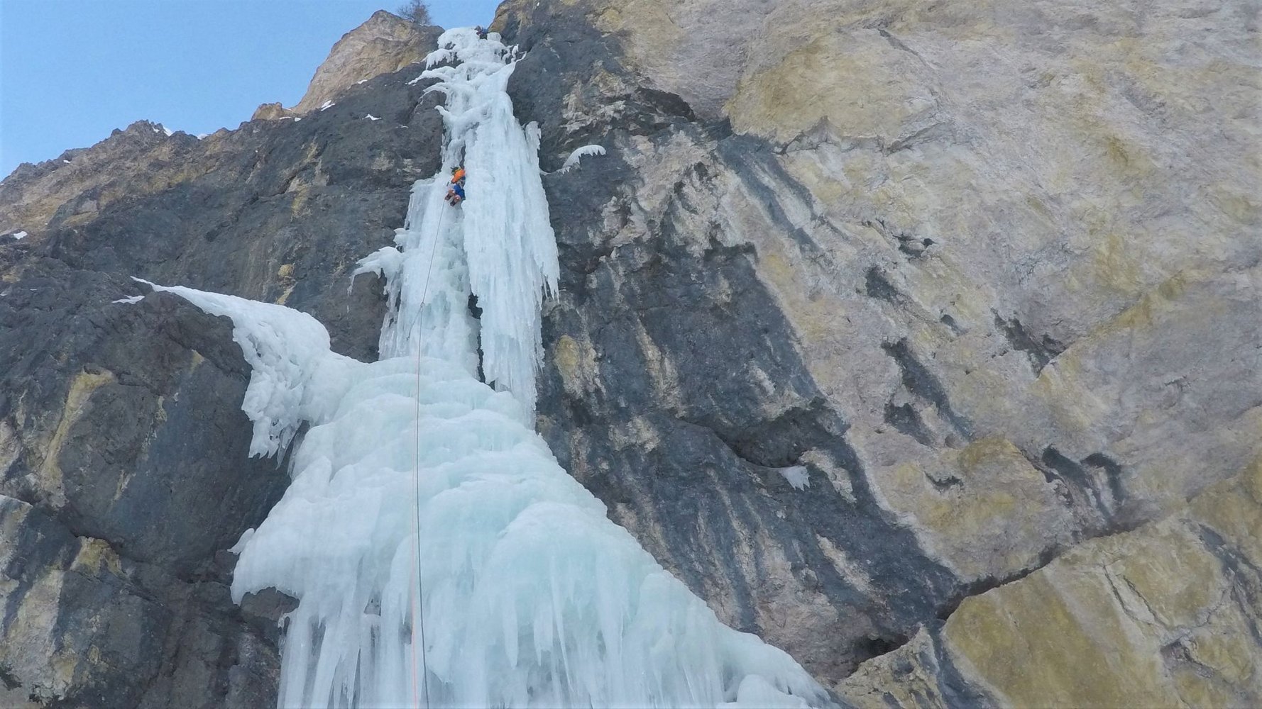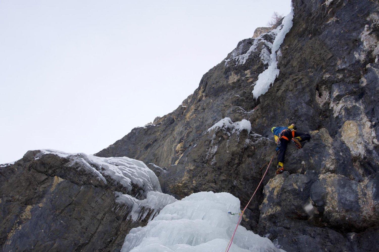 10 Expressschlingen, komplette Eisausrüstung, 5-6 Eisschrauben. Absicherung mit Bolts und Haken. Alle Stände mit Borhaken.