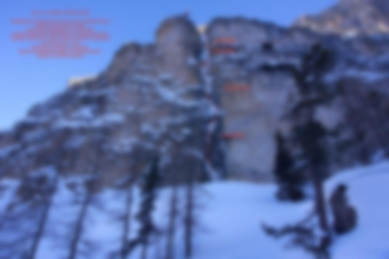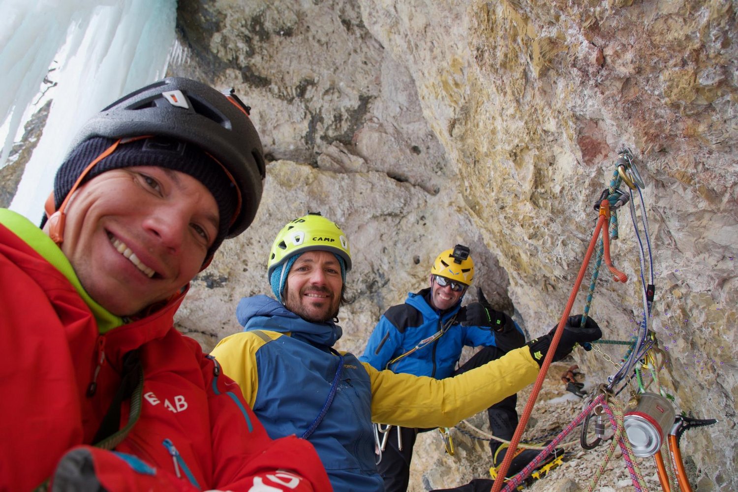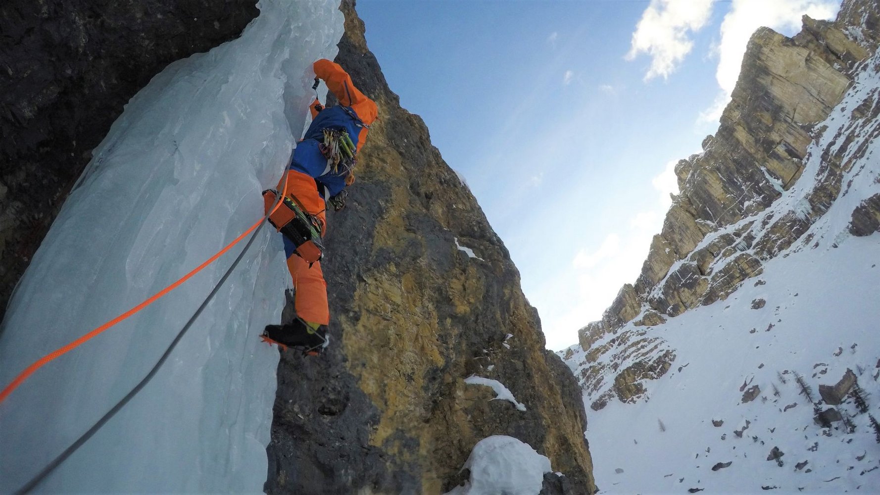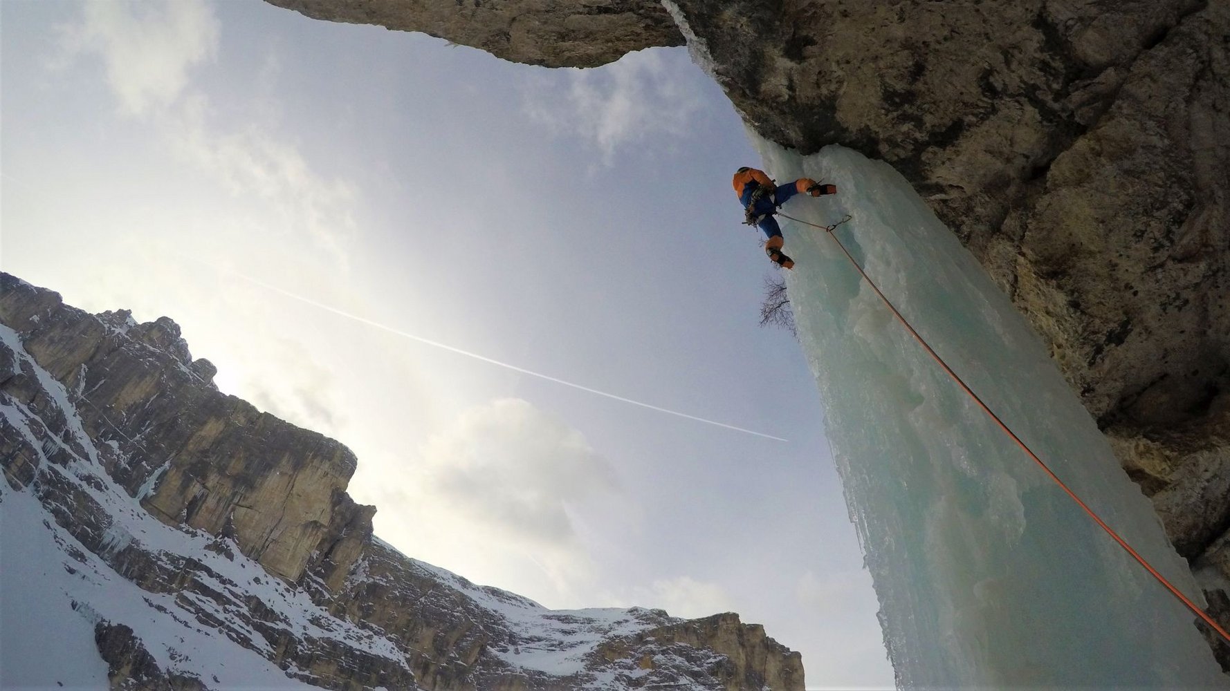 10 Expressschlingen, komplette Eisausrüstung, 5-6 Eisschrauben. Absicherung mit Bolts und Haken. Alle Stände mit Borhaken.