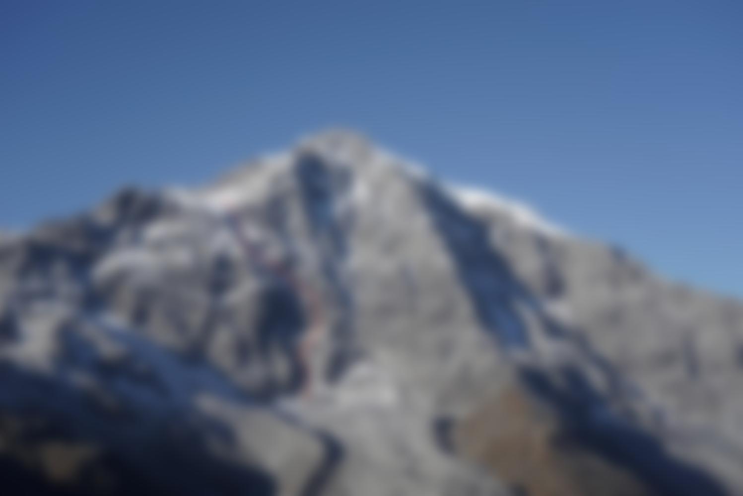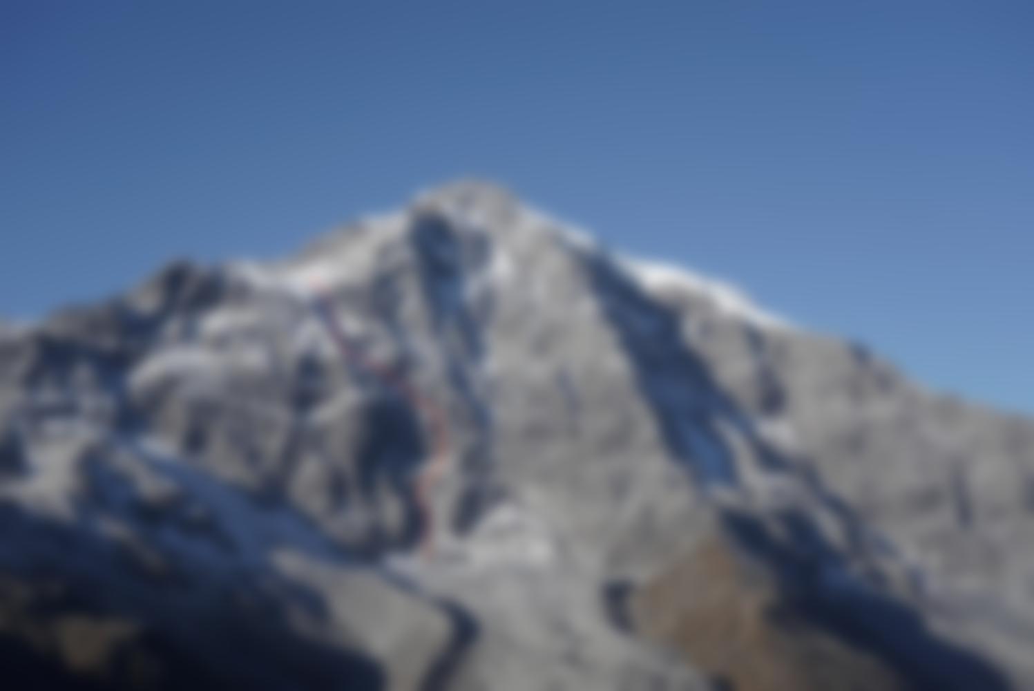 Vom Einstieg im kesselartigen untereren Teil der Wand (bis max. 3) ca. 300 m hinauf zum ersten Steilaufschung. Hier in einem Linksbogen über delikate Platten, Verschneidungen und Bänder zu einem markanten Wasserfall, der hinauf zum Gletscher führt. Insgesamt haben die Erstbegeher ca. 17 Seillängen, 6 davon im reinen Eis gesichert. Die letzten drei Eislängen (ca. 80 m) führen über ein Serac hinauf zum ersten Gletscher des klassischen "Hintergrats" hinauf, wo die Tour endet.