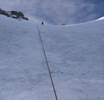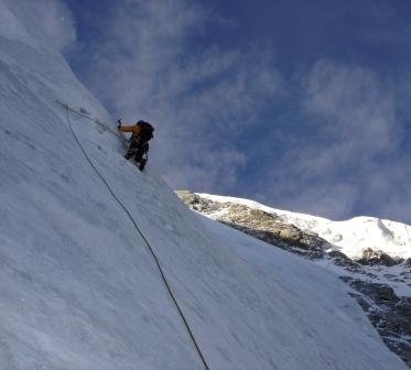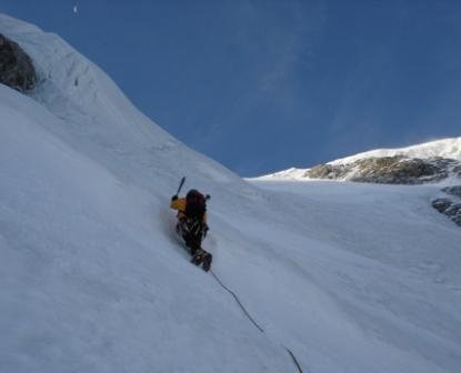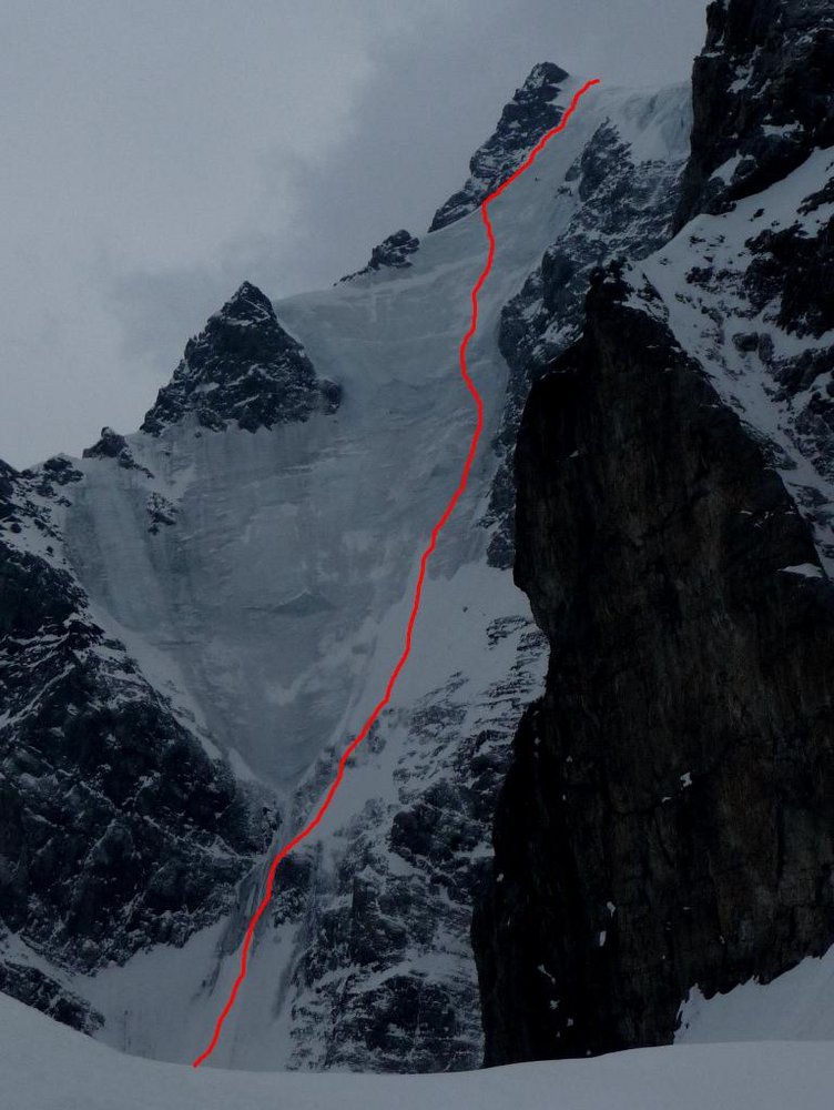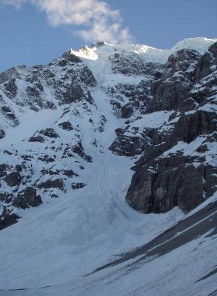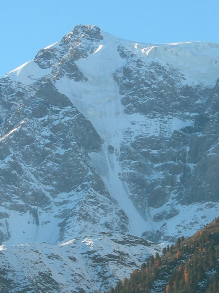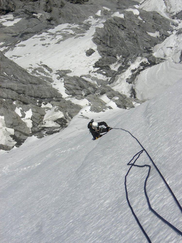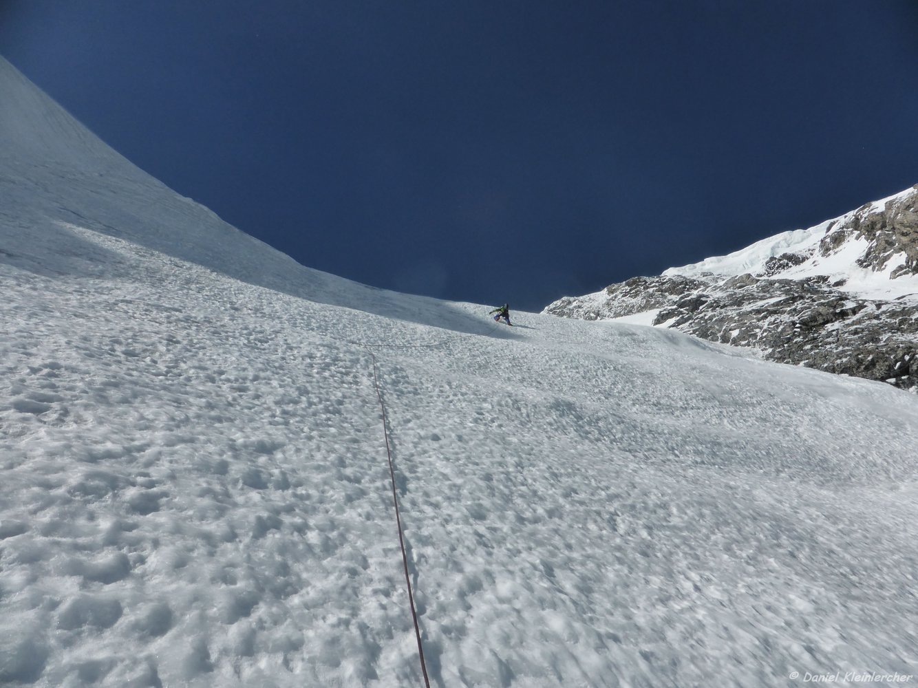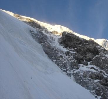 Vorsicht: Der untere Wandteil ist durch einen Eisbruch rechts oben am Gipfelplatau extrem gefährdet. Oft unkontrollierter Serac Abbruch direkt in die Nordwand hinein!!!!