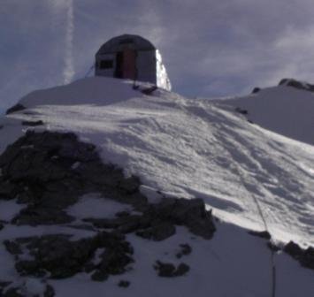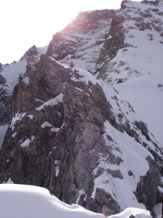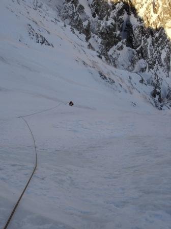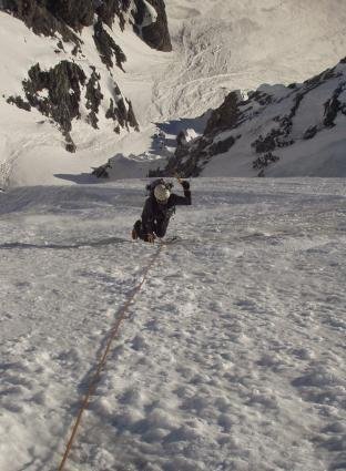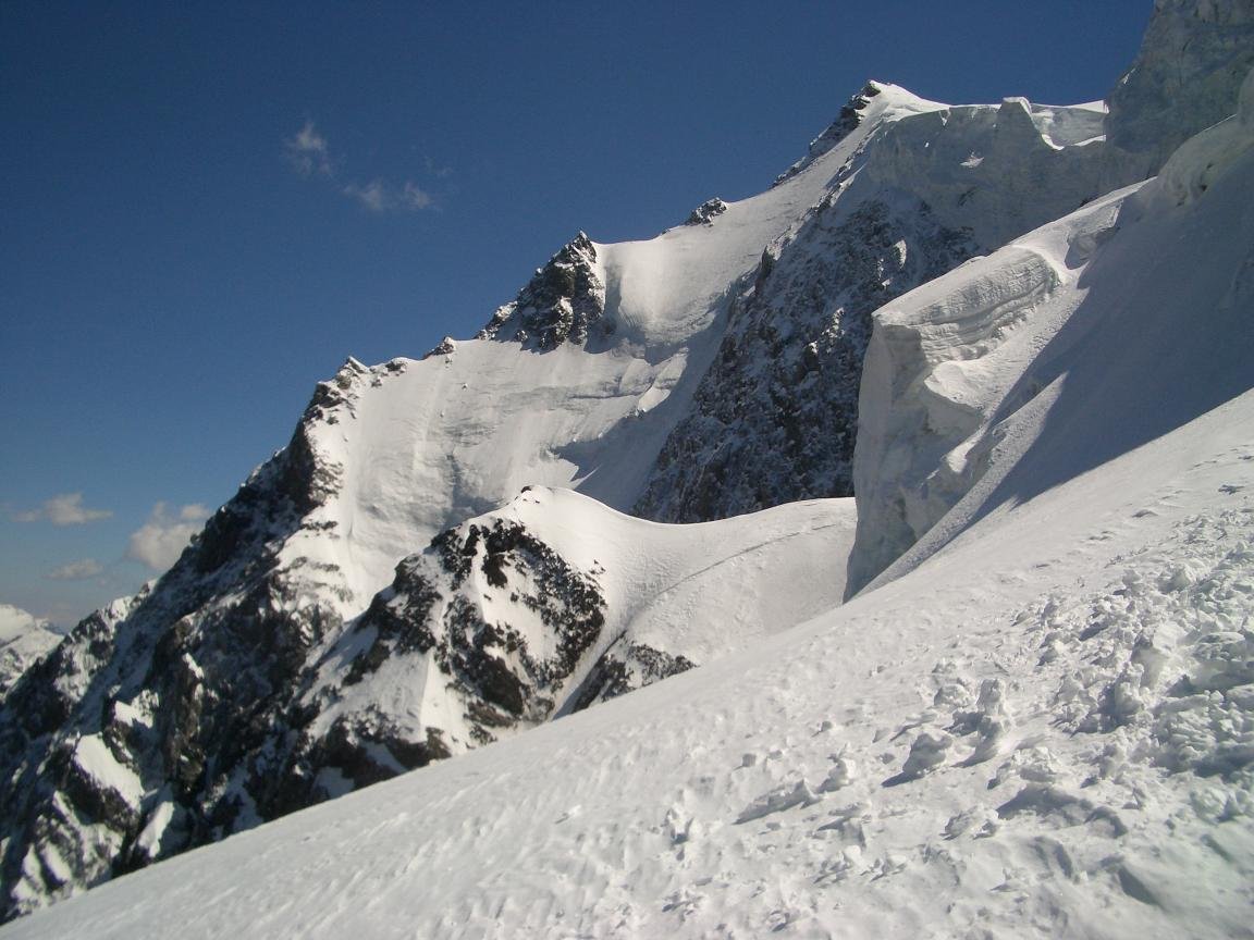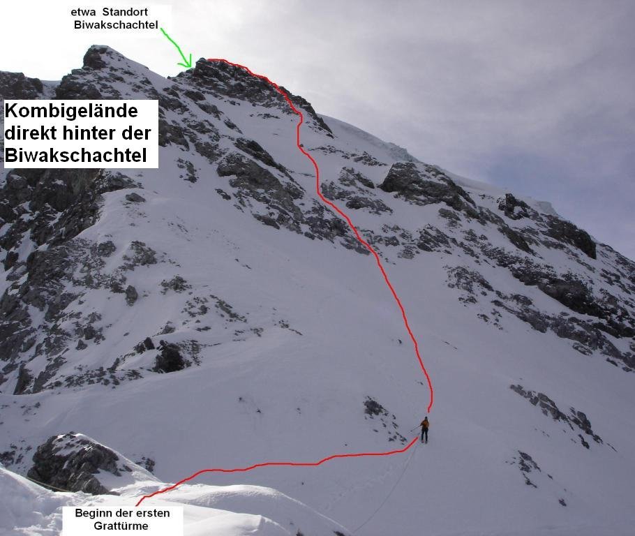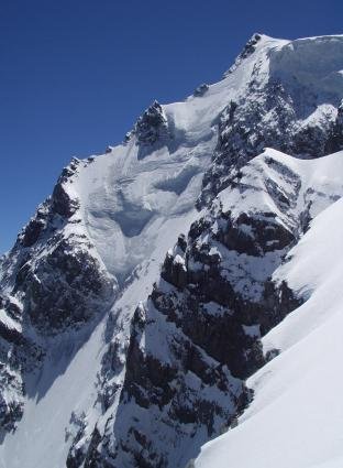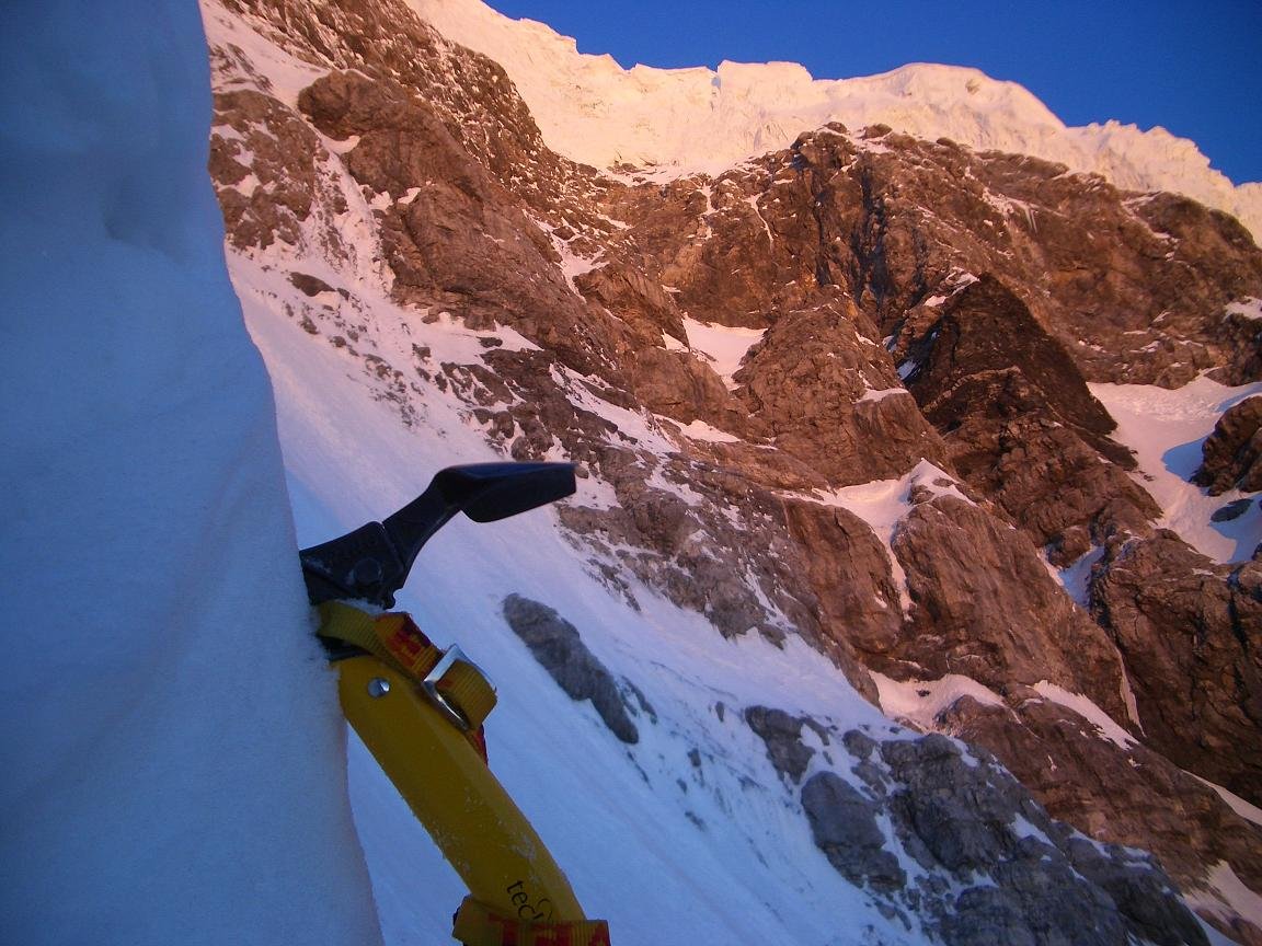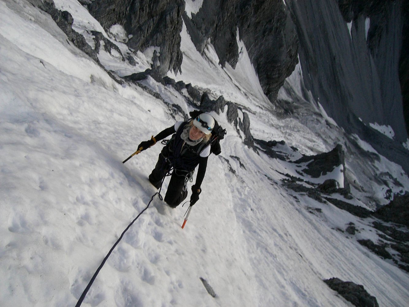 Vorsicht: Der untere Wandteil ist durch einen Eisbruch rechts oben am Gipfelplatau extrem gefährdet. Oft unkontrollierter Serac Abbruch direkt in die Nordwand hinein!!!!