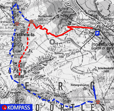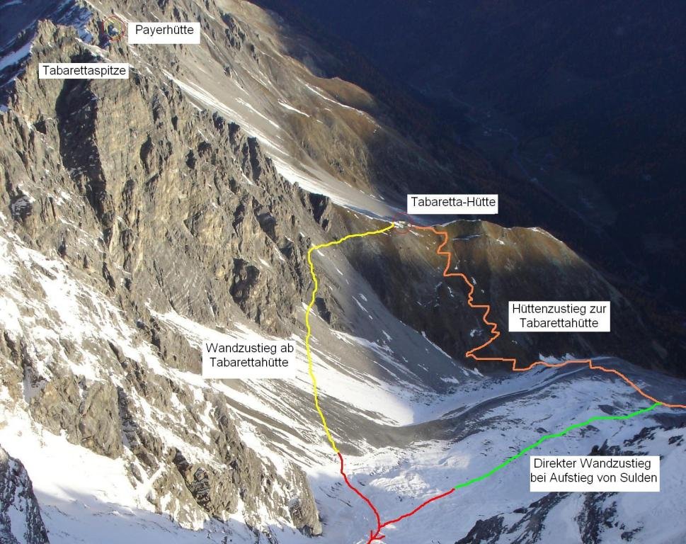 Über den Normalweg zur J. Payer Hütte (steiler Firn, Fels 1-2 ) und von dieser über die Tabaretta Hütte zurück ins Tal. Bei Nebel besser über den Hintergrat (Fels 1-2) bis Hintergrathütte, von dieser unschwierig ins Tal.