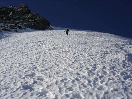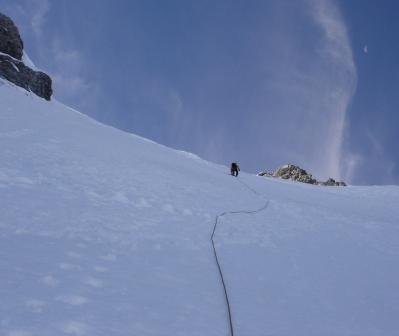 Firn bzw. Eis bis 55° - beim Abstieg Kletterei (je nach Ausaperung) bis max. 1-