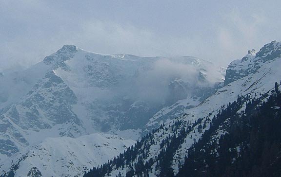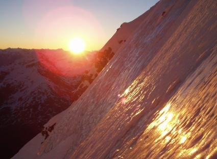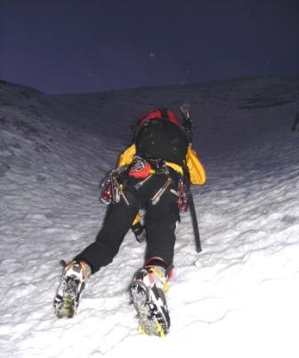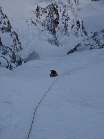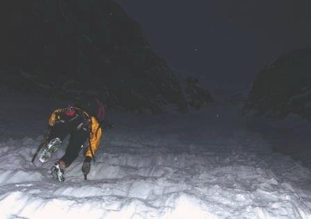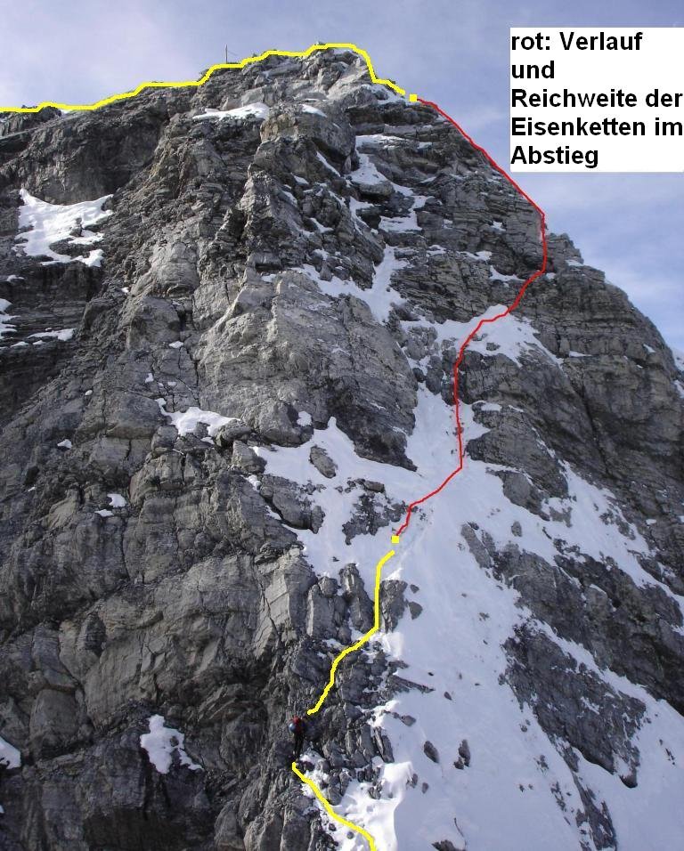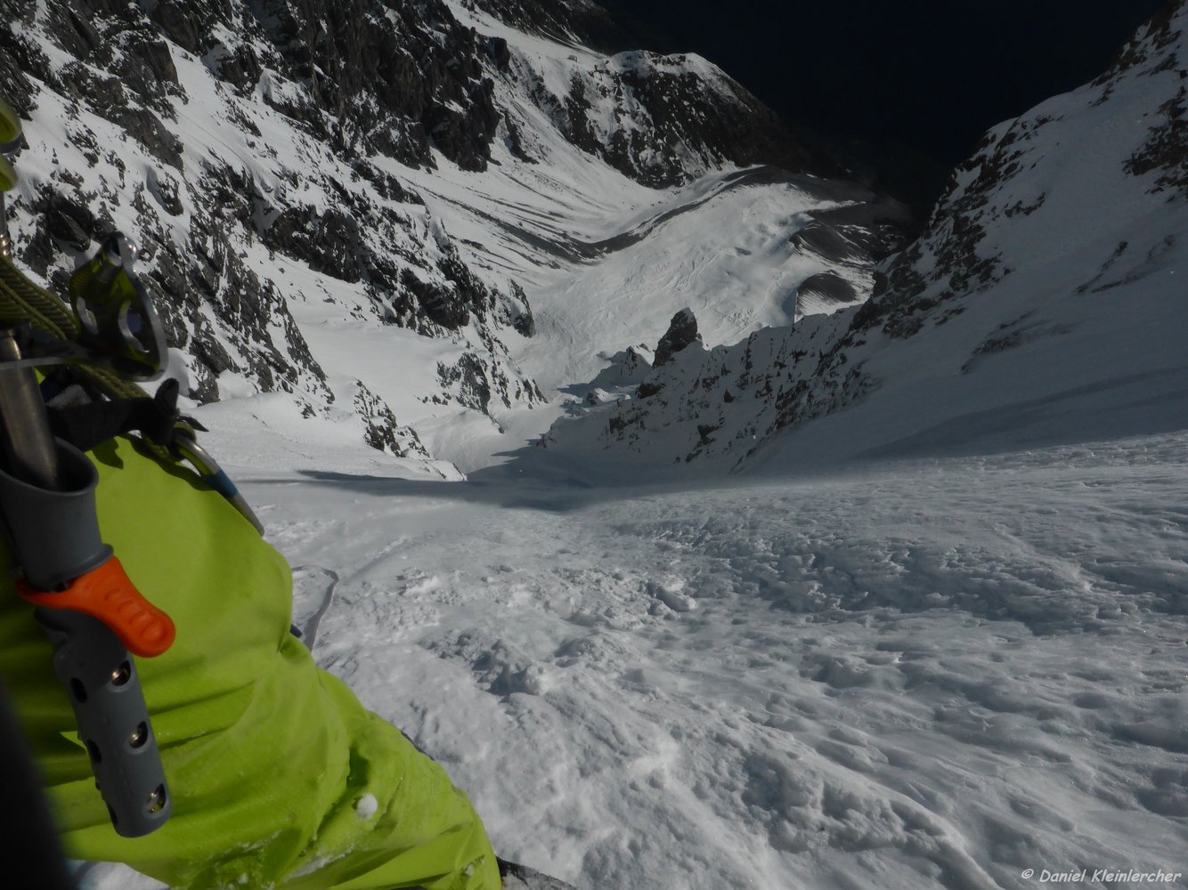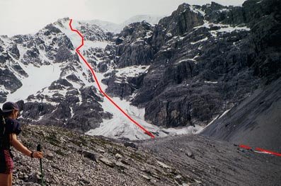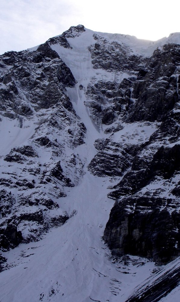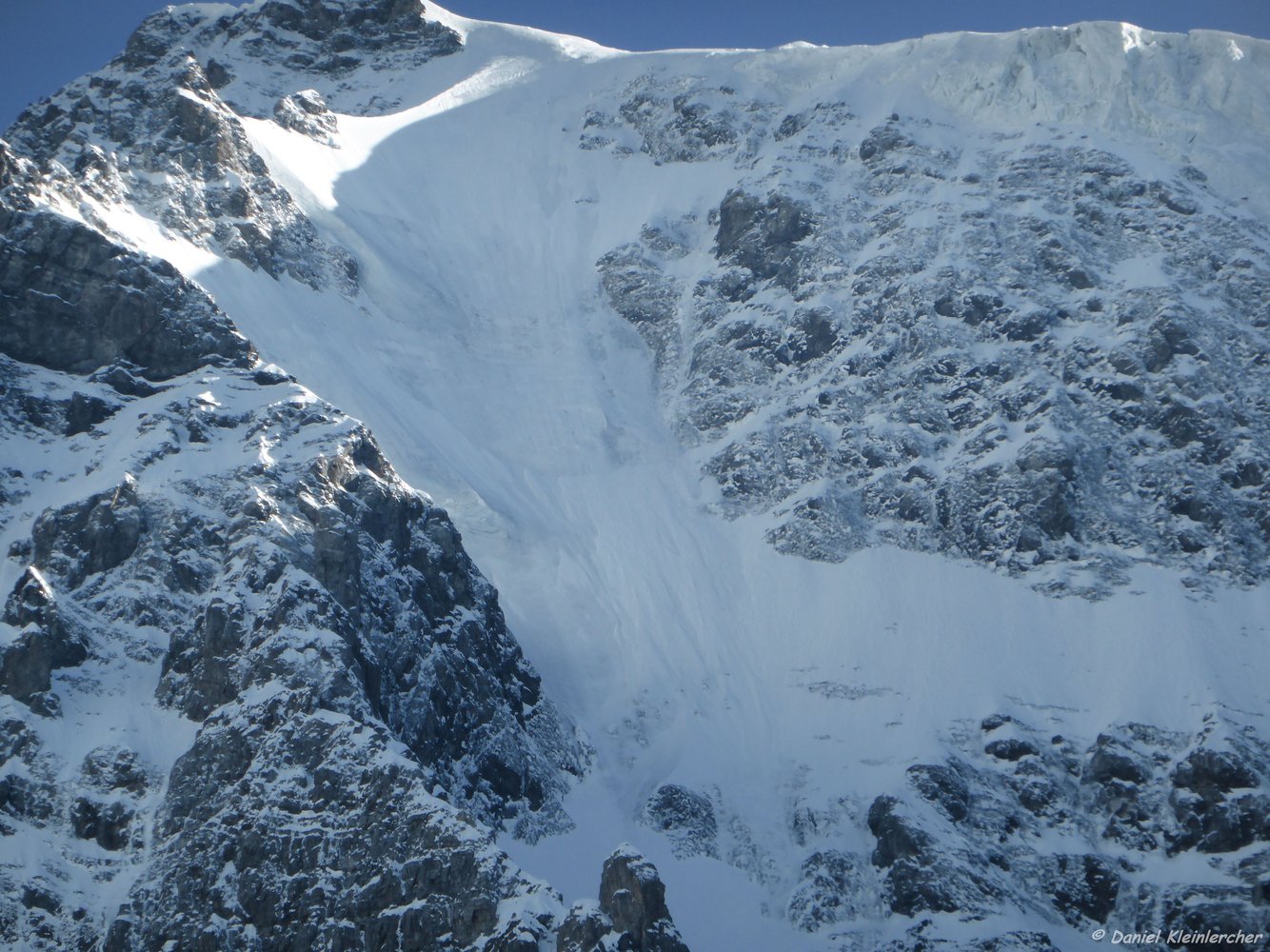 Vorsicht: Der untere Wandteil ist durch einen Eisbruch rechts oben am Gipfelplatau extrem gefährte. Oft unkontrollierter Serac Abbruch direkt in die Nordwand hinein!!!!