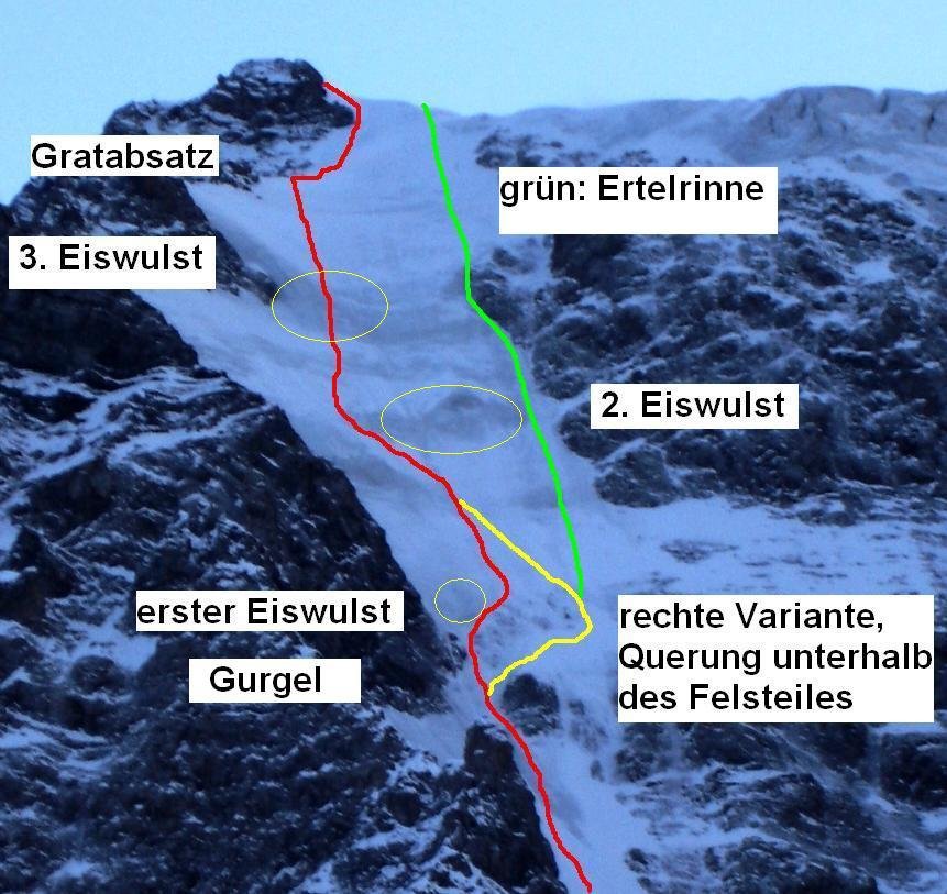Vom Einstieg immer steiler bis in deren steilen Mittelteil, hier mehrere Varianten über oder um 3 Eisstufen möglich, meist wird rechts oder links ausgewichen. Oben wird die Wand dann wieder etwas flacher. Vom Ausstieg in wenigen Minuten zum Gipfel.