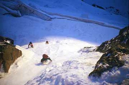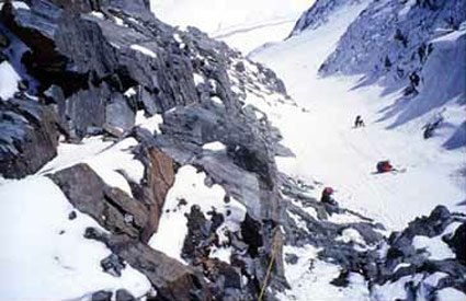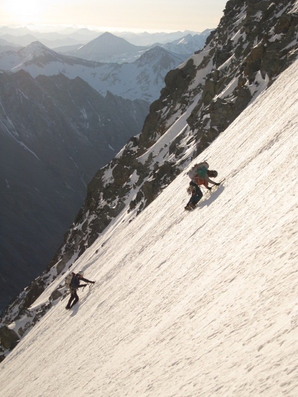 Der berühmteste Eisanstieg Österreichs durch die Nordseite des Grossglockners ist ein Muss fuer jeden Steileisartisten. Die durchgehende Eis- bzw. Firnschicht ist zwar nur im Frühjahr vorhanden, aber trotzdem ist eine Begehung ein fantastisches Abenteuer. Kaum zu glauben, dass Markgraf Pallavicini mit seinen zwei Bergführern die Rinne vor mehr als 100 Jahren als Erster durchstiegen hat. Heute steht eine Biwakschachtel nahe des Einstieges. Sie ist zwar immer hoffnungslos überfüllt, aber als Stützpunkt nicht mehr wegzudenkten.