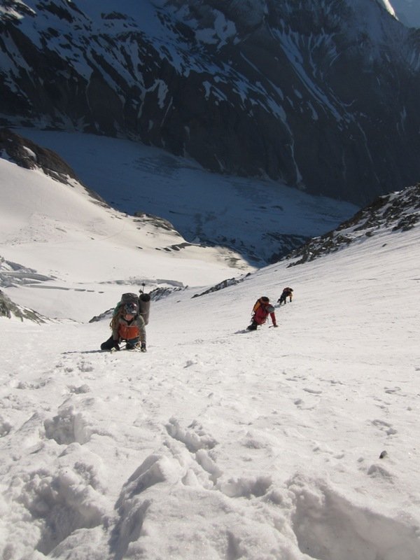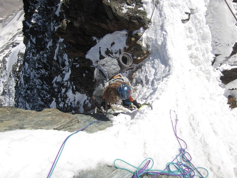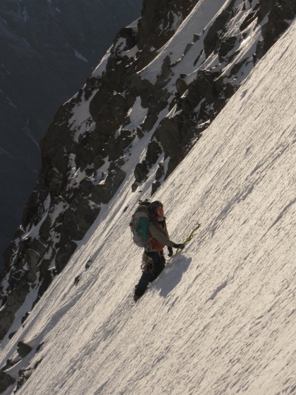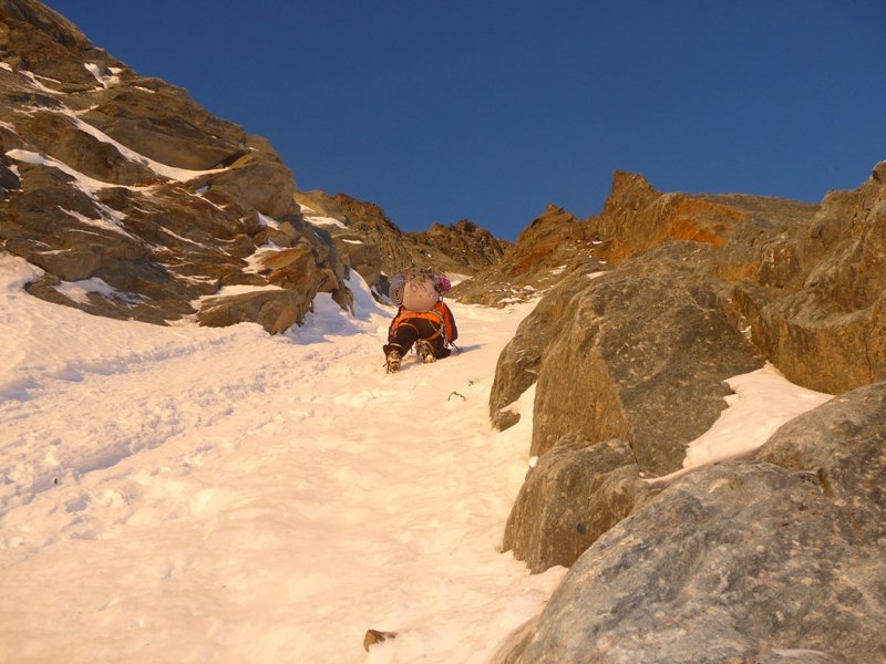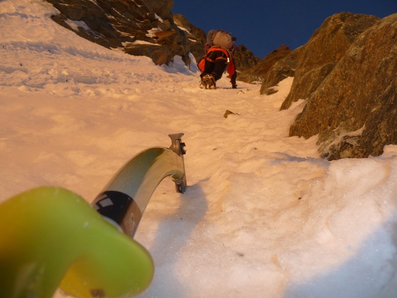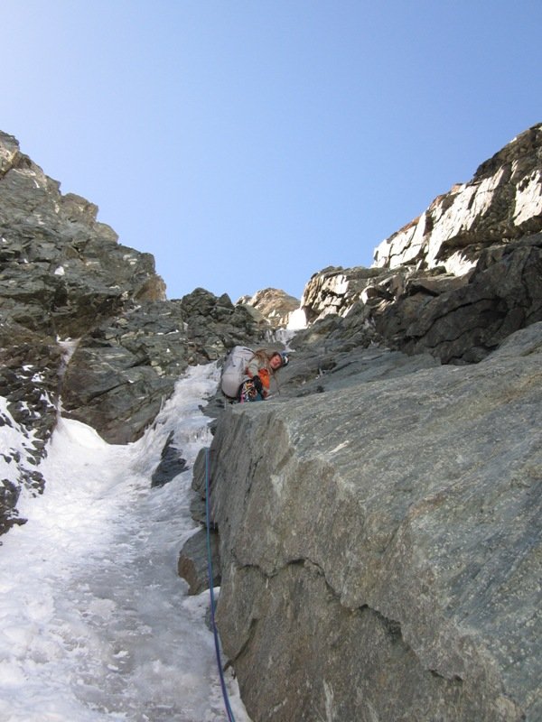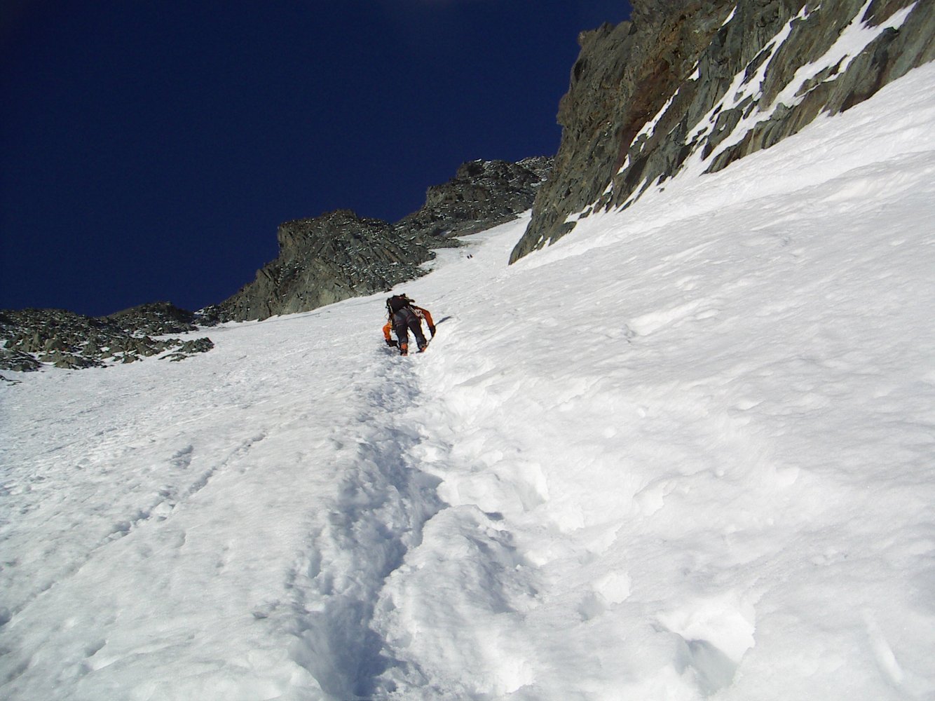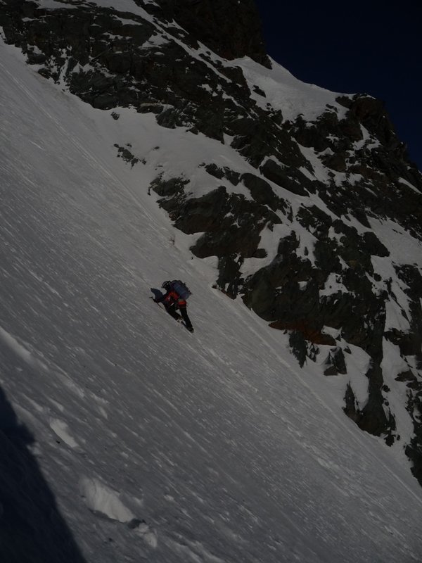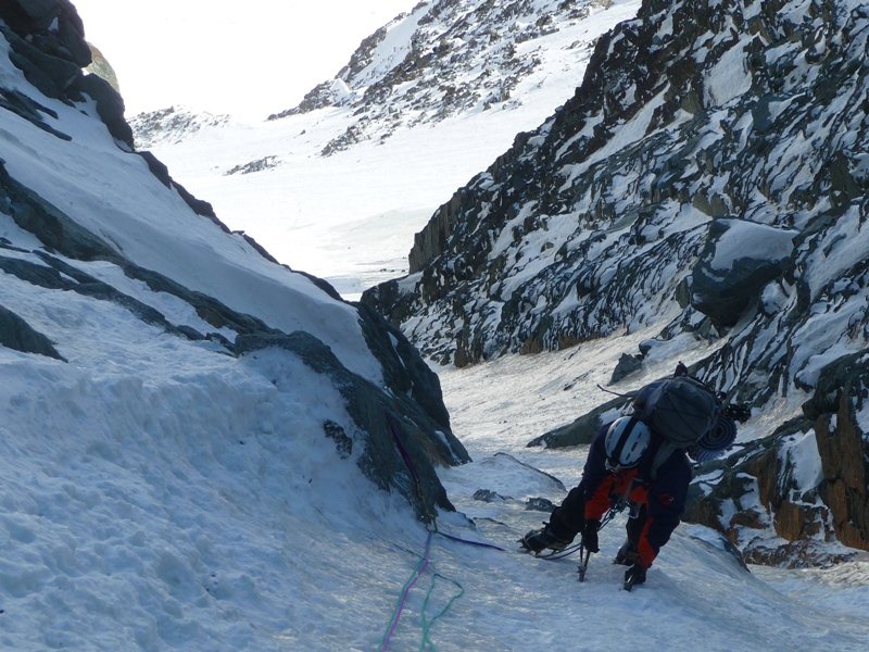 Eis bis 55 Grad (bei der Randkluft auch steiler), Fels bis 2 - 3 Anspruchsvolle und hochalpine Eistour. Die Rinne ist sehr Steinschlaggefaehrdet (früher Aufbruch!) und nach Neuschneefällen herrscht akute Lawinengefahr. Es gibt auch 4 "Fluchtmöglichkeiten" am linken Rinnenrand, die aber meist 65 Grad steil sind und teilw. kombiniertes Gelände aufweisen.