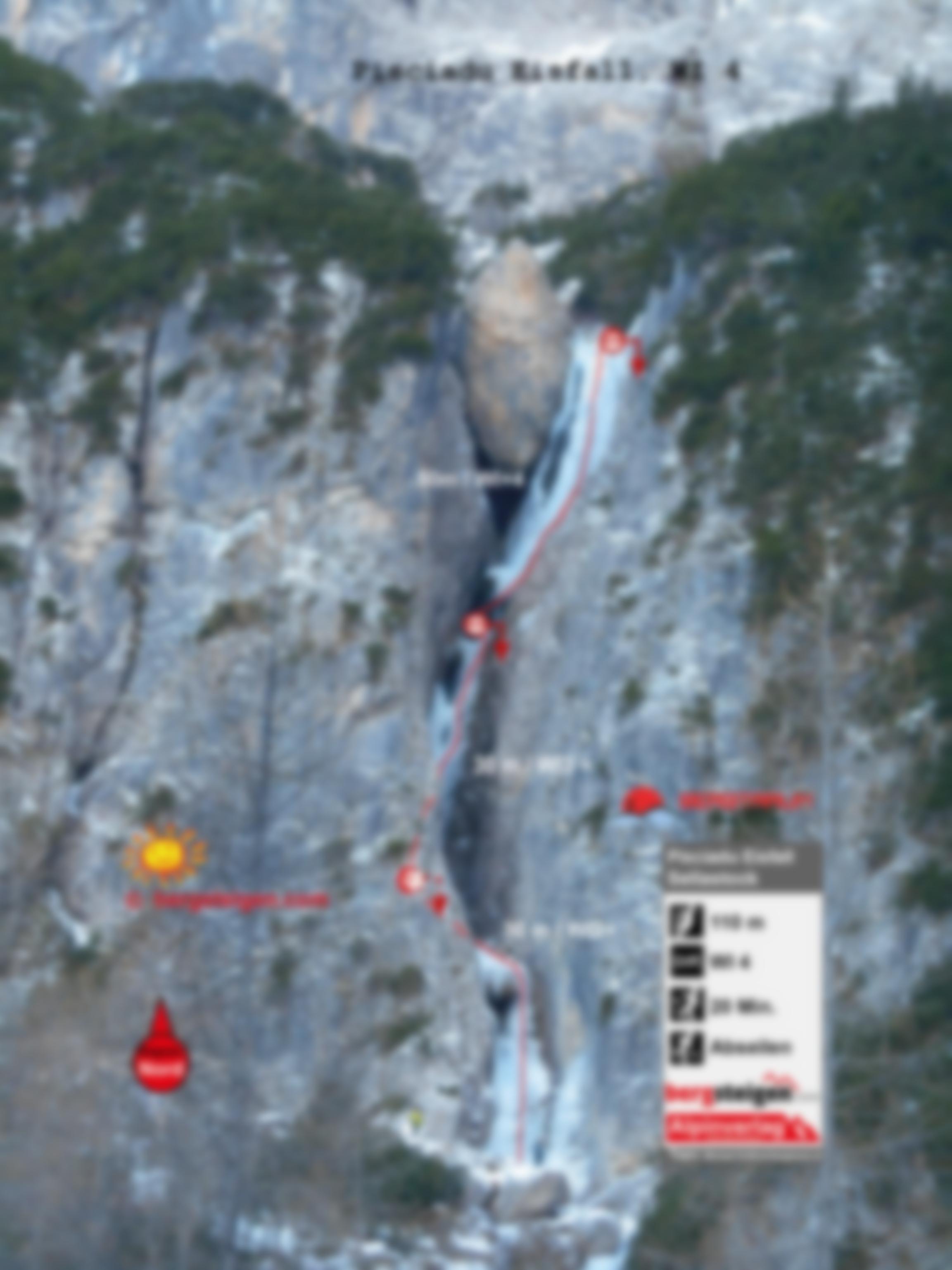 3 SL: L1: WI 2+, 30 m. L2: WI 3+, 30 m. L3: WI 4, 50 m; 110 m Wandhöhe