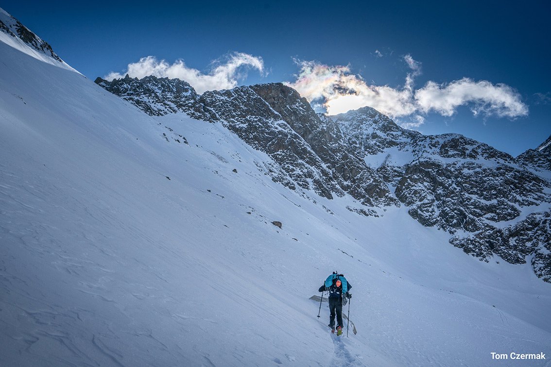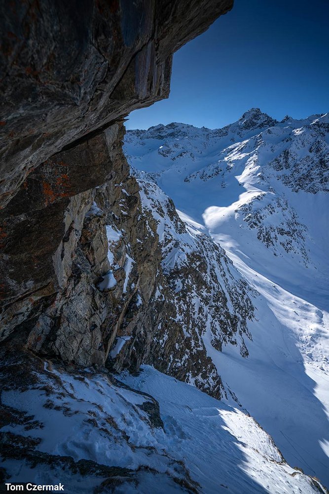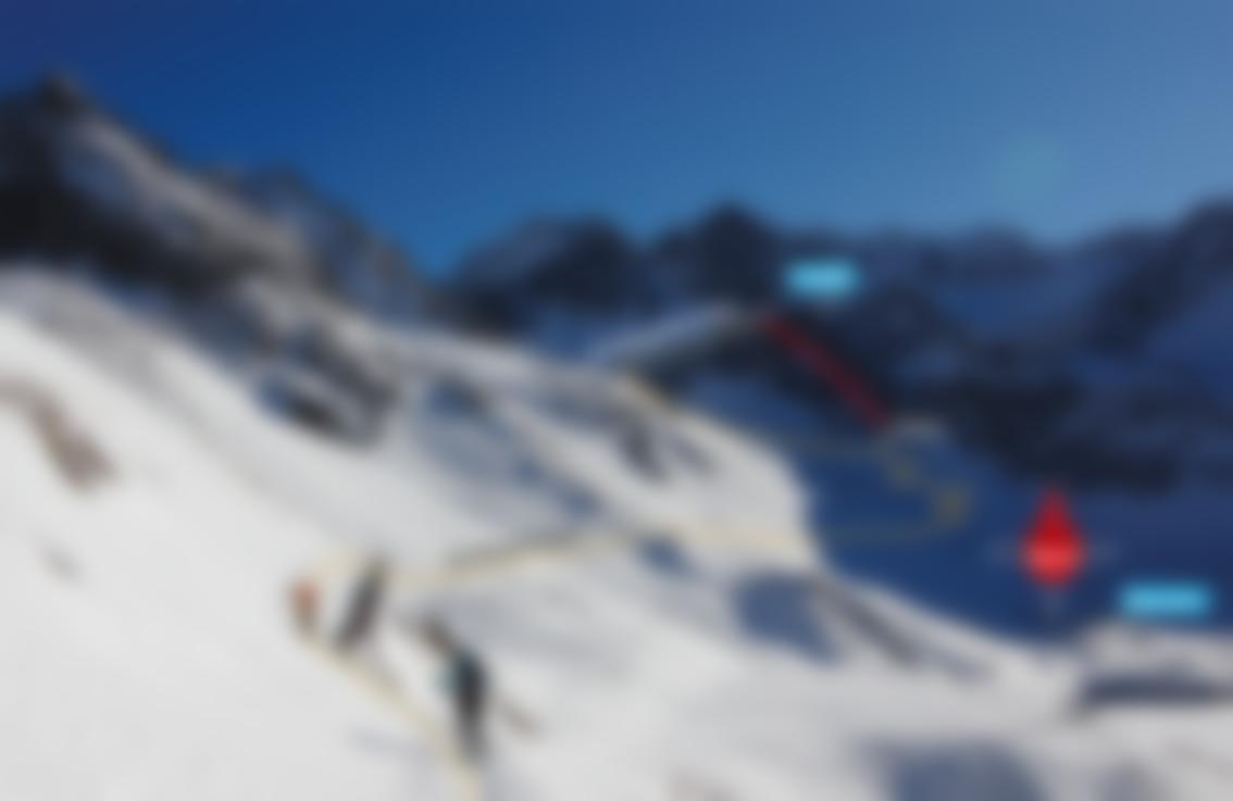 Option 2 (theoretisch auch ohne Ski möglich, aber nicht empfohlen): Vom Tal aus Richtung Speicher Finstertal aufsteigen, dann östlich von dem Speicher der Skitourenspur von Schartenkopf und Sulzkogel Richtung Norden folgen. Diese am Ende des Sees verlassen und durch eine lawinengefährdeten Hang zum Einstieg queren. Bei dieser Variante ca. 300 Hm mehr.