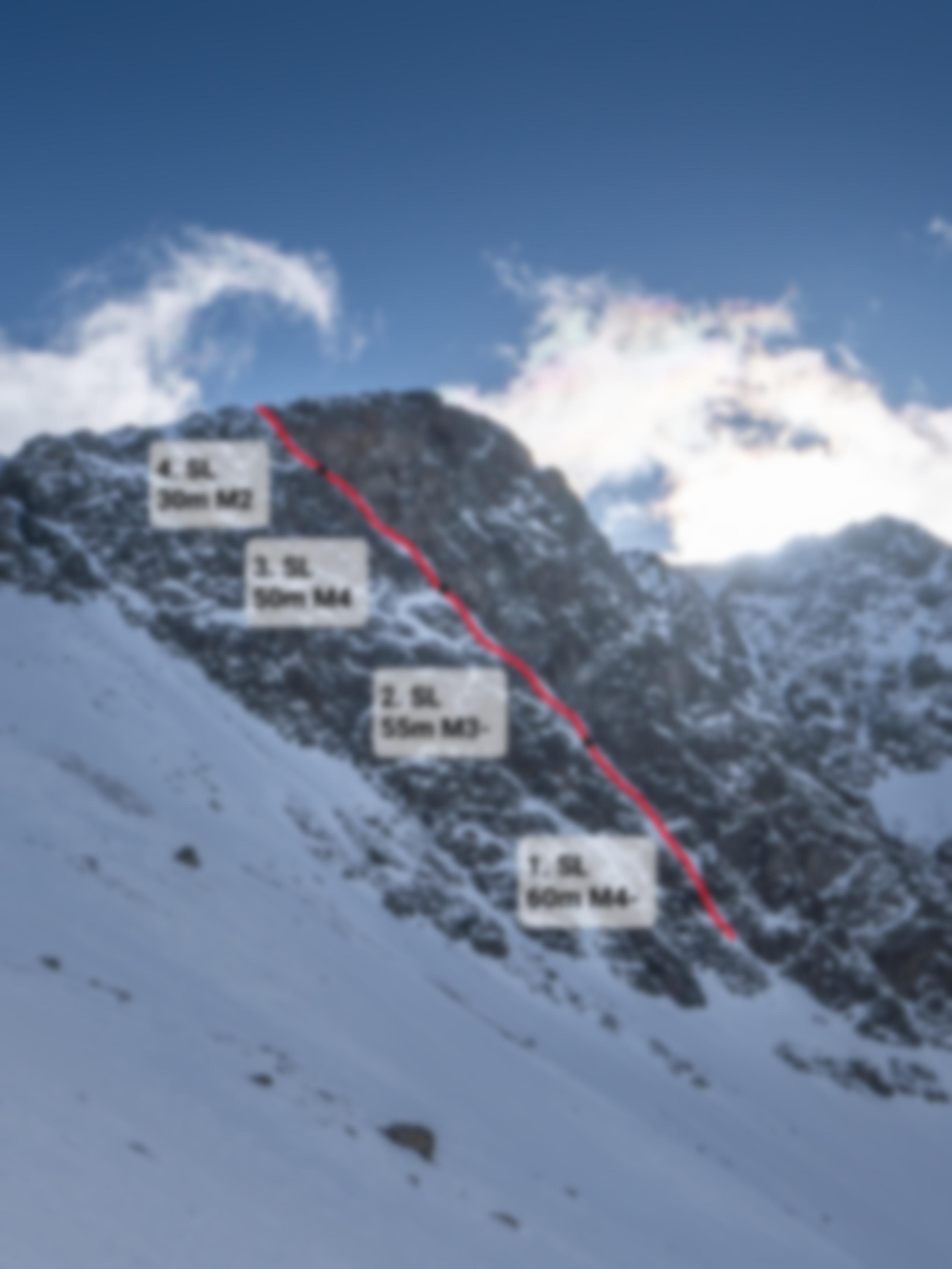 Trotz der eher geringen Kletterschwierigkeit handelt es sich um eine anspruchsvolle, alpine Wintertour. Die Lawinengefahr, besonders in Zu- und Abstieg, ist zu beachten!