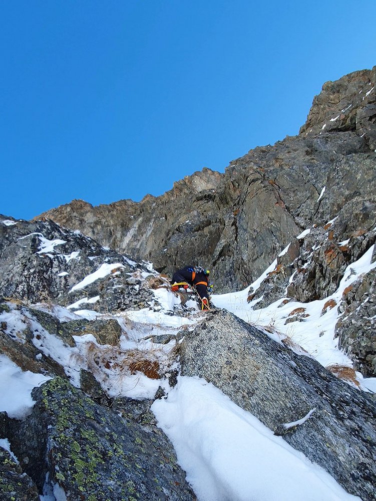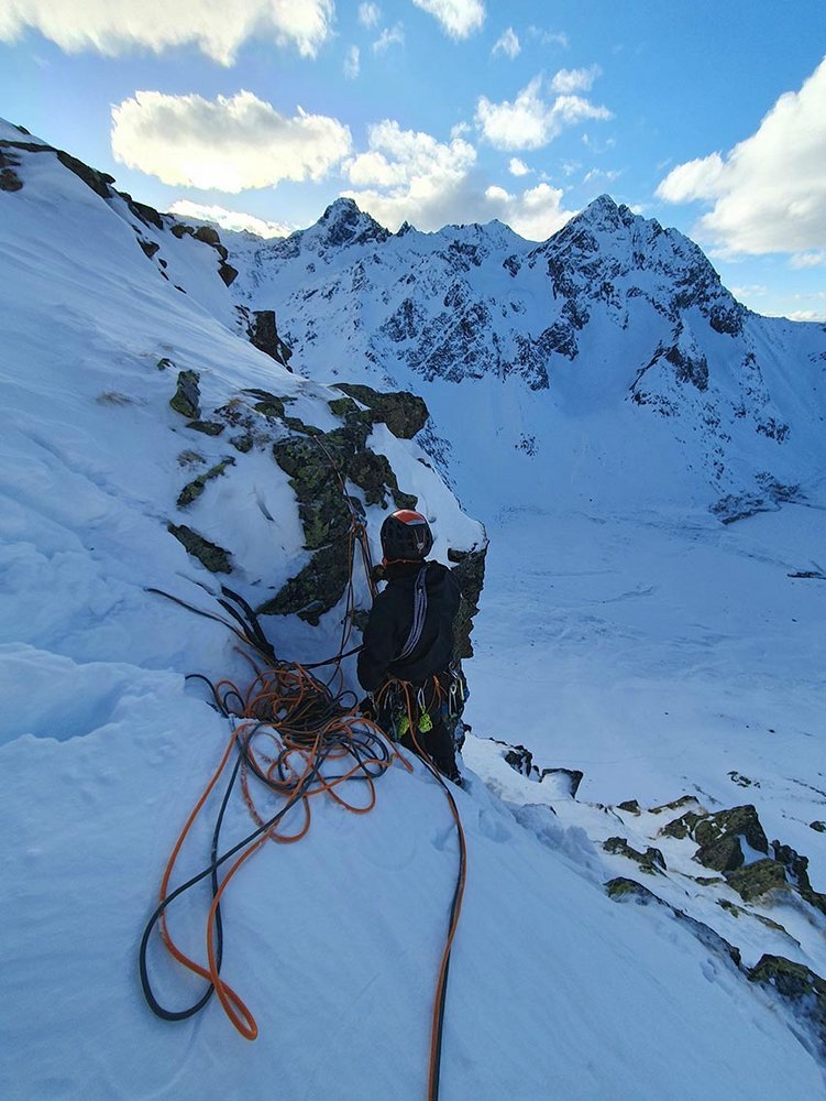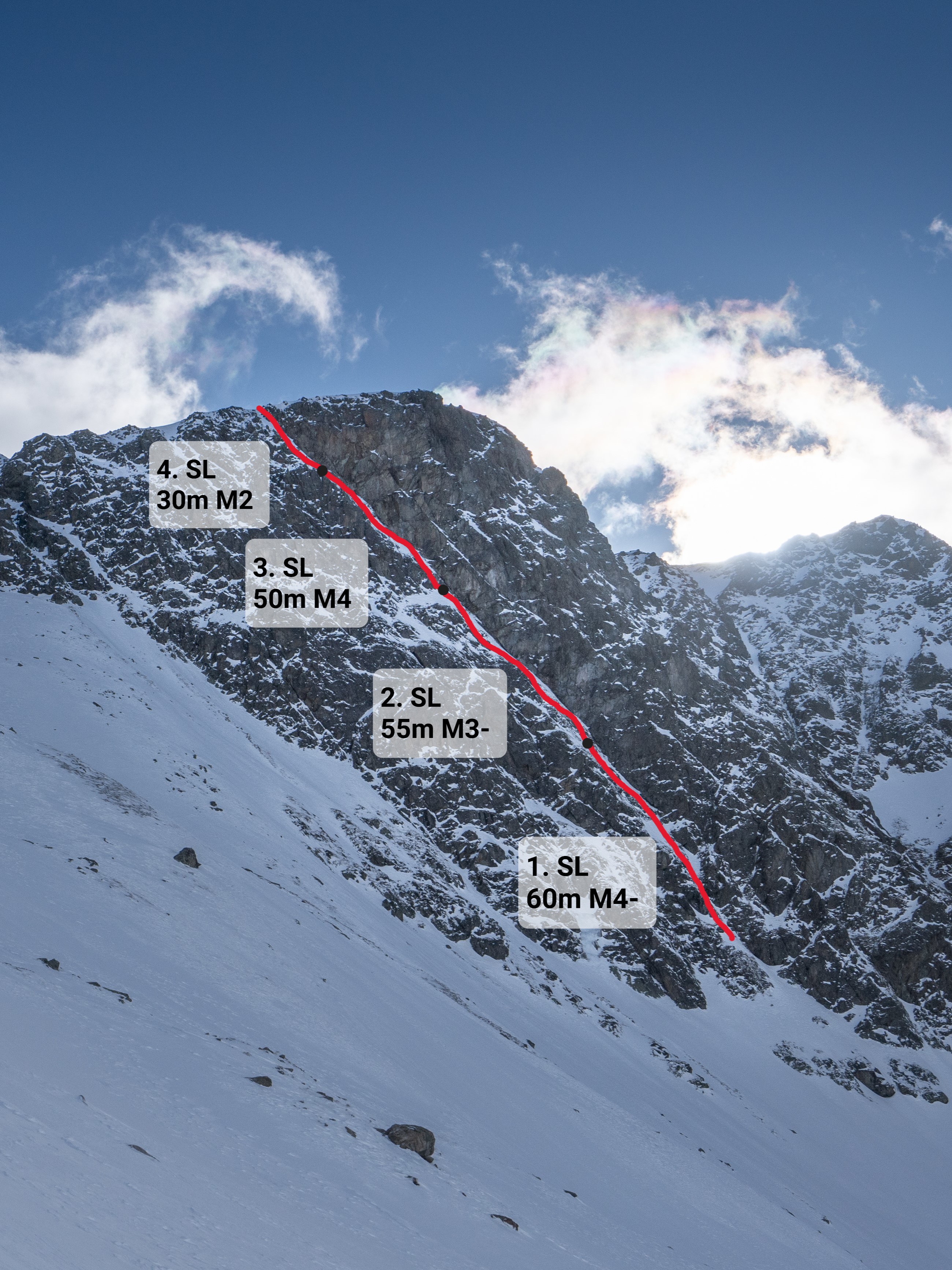 Tom Czermak und Frederik Fahr am 17.02.2025 (wahrscheinlich, da keine Begehungsspuren gefunden wurden und keine Informationen in Alpenvereinsführern und im Internet zu finden sind)