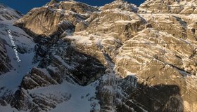 Mixedtour in der Hoher Göll - Ostwand. Verläuft über logische Band- und Rinnensysteme. Unteres Drittel vereiste Verschneidung, Mittelteil Schnee/Eis mit Mixedpassagen, obere Hälfte bis auf eine kurze M3 Stelle Schneestapfen. Sonnenstand - Jahreszeit entscheidend, schnell wechselnde Verhältnisse.
