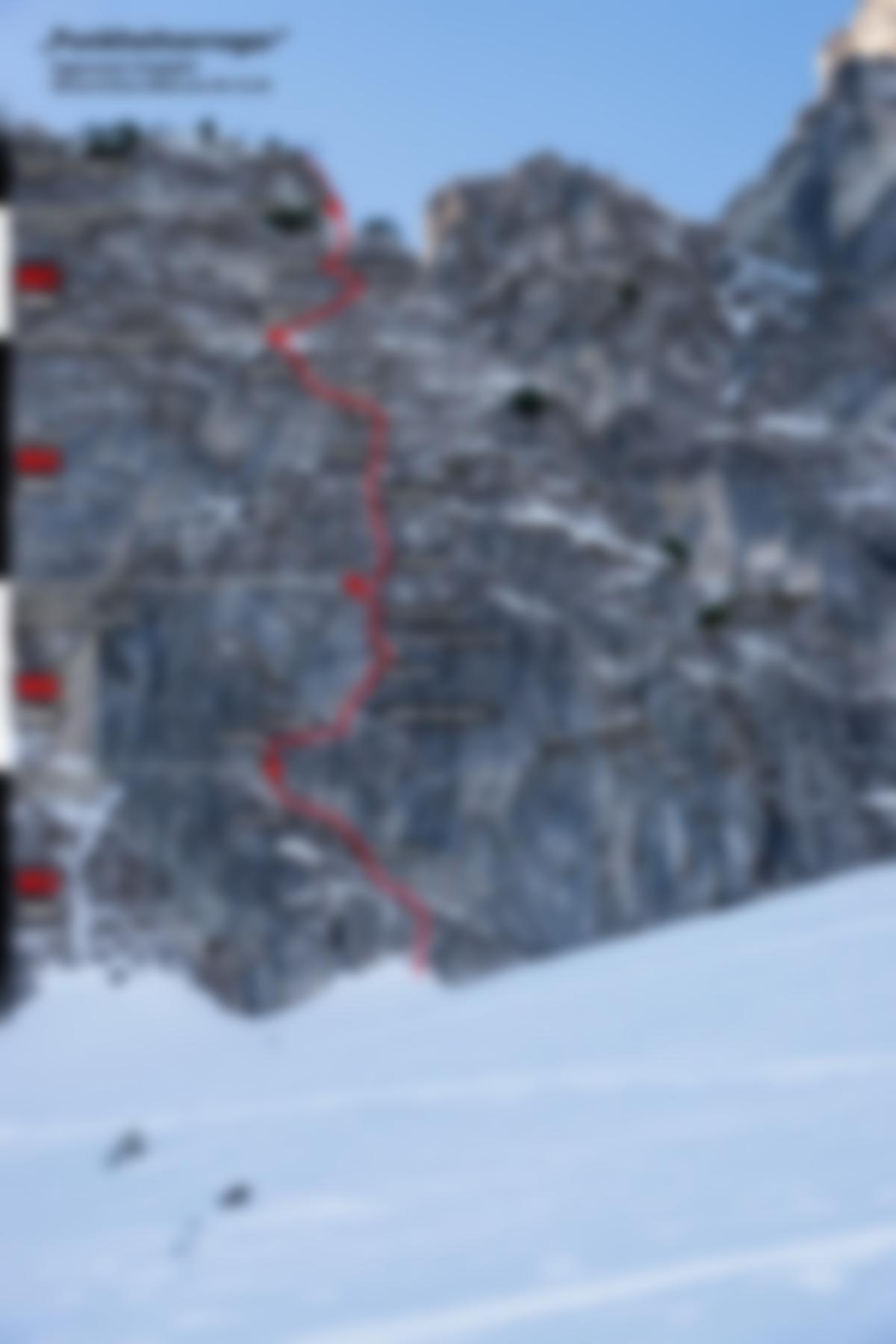 Siehe Topo. 20m über eine markante Rampe, bis man gut in die Schlüssellänge einsehen kann, dort Stand machen. Vom Stand noch kurz gerade hoch unter einen Block, dann diagonal nach rechts queren. Auf einem Henkelband vor der Crux steckt ein Schlaghaken. Der lose Block rechts davon sollte weder zum Klettern noch zum Sichern genutzt werden! Zwei athletische Drytoolingzüge und ein Henkel (Totem 0.3) führen zum großen Graspolster. Ab hier leichter 10m durch die Rinne nach oben, bevor links auf einem Absatz Stand bezogen werden kann (ein fixer Schlaghaken). Dieser Stand ist zeitaufwendig einzurichten. Die dritte Seillänge startet durch einen Gully und bietet Graskletterei vom Allerfeinsten. Unter einem Felsband linkshaltend und zum Stand an kleiner Fichte + Eisgeräte. Die Schwachstelle im folgenden Felsriegel ist gut sichtbar, in einer Rechtsschleife geht es durch dubiosen Fels ans überhängende Graspolser und danach flach zum Bohrhakenstand der "A Guats Nuis". Von hier Seilfrei oder am laufenden Seil über den Grasrücken empor, der sich zu einem schönen spitzen Grat verjüngt. Fichten bieten gute Sicherungsmöglichkeiten. Zum Schluss kann links durch zwei Seillängen (ca M3-4) oder rechts in nur 25m (M4) ausgestiegen werden. Stand an Eisgeräten oder direkt am Körper auf der anderen Gratseite.