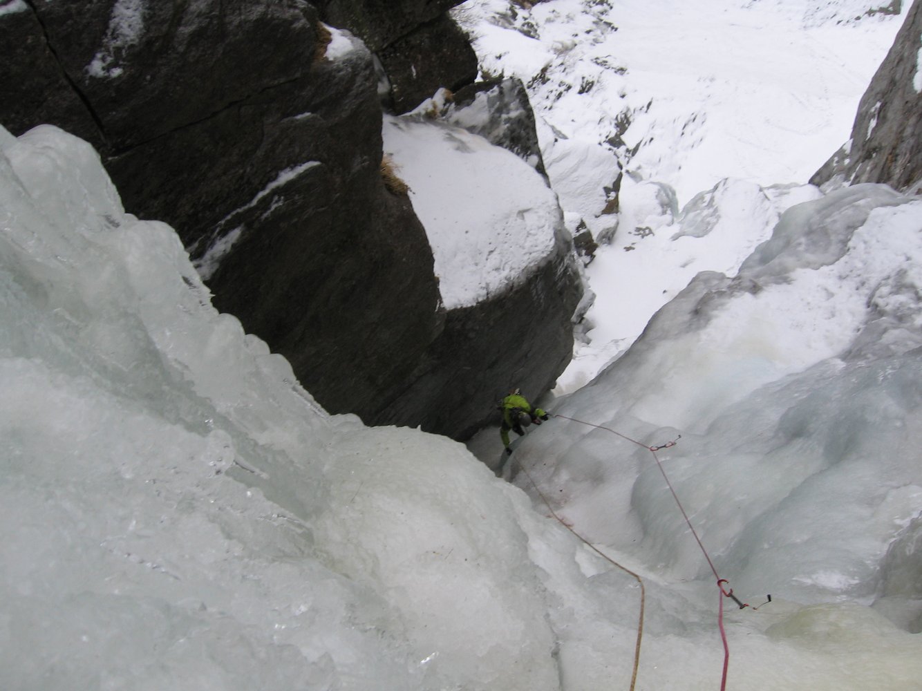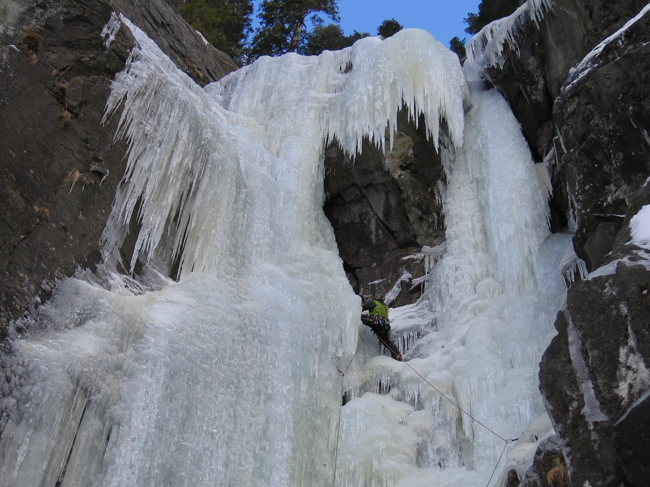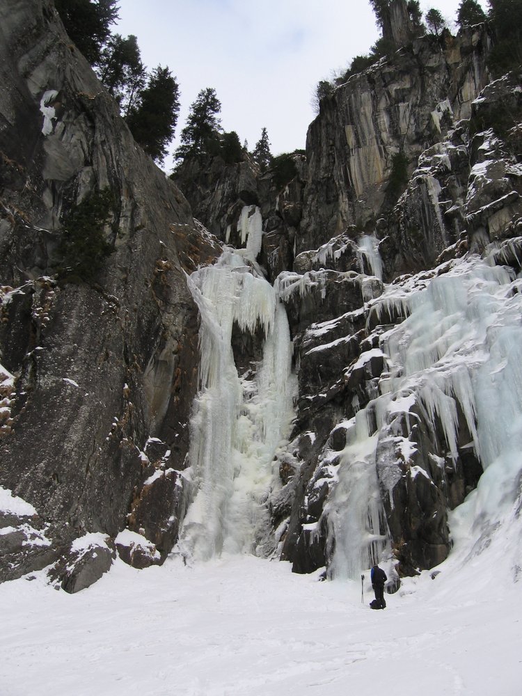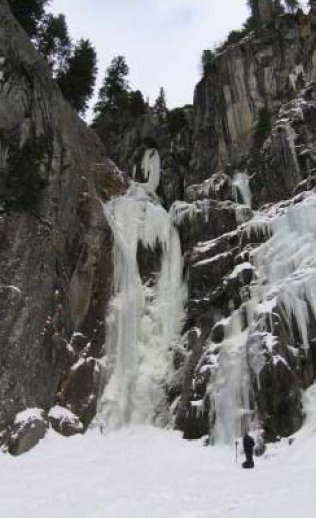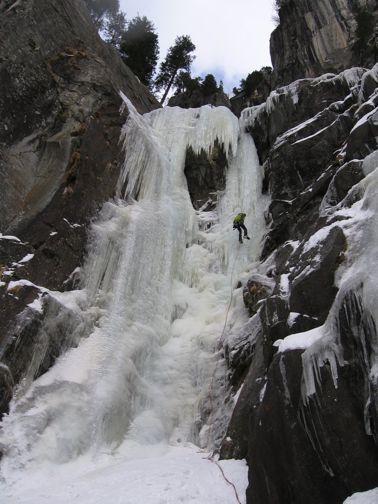Siehe Übersichtsbild. Erste Seillänge WI 4+, dann Stand und oben noch einmal 40 m WI 5-.