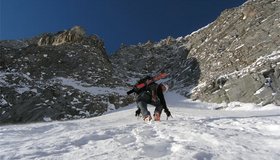 Schöne Firn/Eisrinne auf den Rauriser Sonnblick. Die Rinne verläuft rechts des Gipfelpfeilers und endet oben unweit des Zittelhauses. Die Tour ist wegen des Felsausstieges deutlich anspruchsvoller als die Nordwandrinne (linke Sonnblickrinne).
