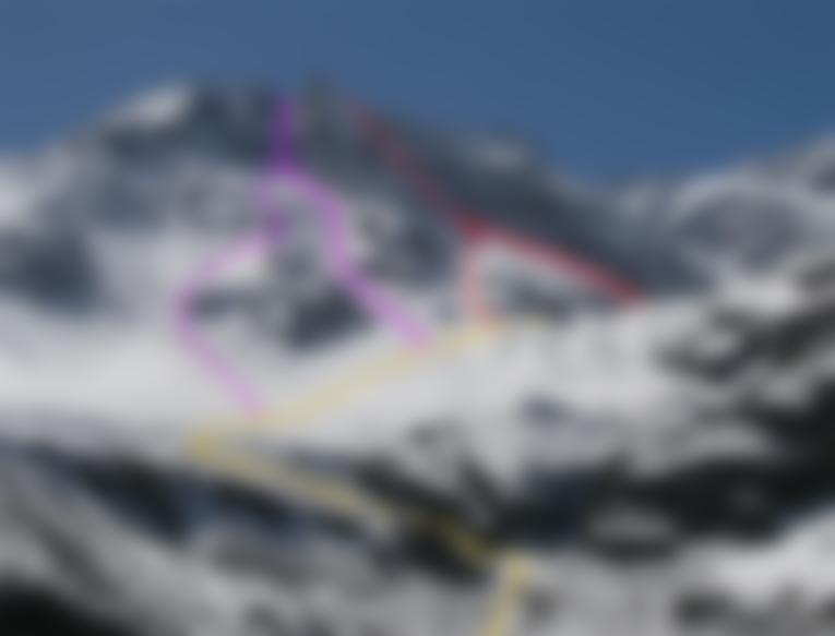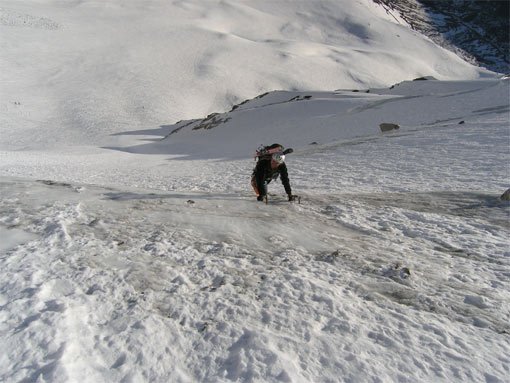 Zuerst steil über eine Eisstufe in flacheres Gelände, über das man die Randkluft erreicht. Nach der Randkluft immer steiler aufwärts in der nach oben hin enger werdenden Rinne. Oben links in der engen Rinne an einem mark. Felsturm vorbei, auf die erste kurze - recht glatte - Felsstufe zu (rechts unter der Felsstufe steckt ein Haken). Nach deren Überwindung kurz flacher zu nächsten Felsstelle. Hat man die Stufe hinter sich, wird die Rinne etwas weiter und man steigt über die Kante auf das Kleinfleißkees. In wenigen Minuten zum nahen Zittelhaus auf dem Gipfel.