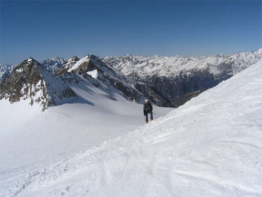 Man folgt der Schitourenroute des Hocharn bis man nach der ersten Steilstufe auf die Überreste des Pilatuskeeses trifft und steigt dann direkt unter die Rinne auf.