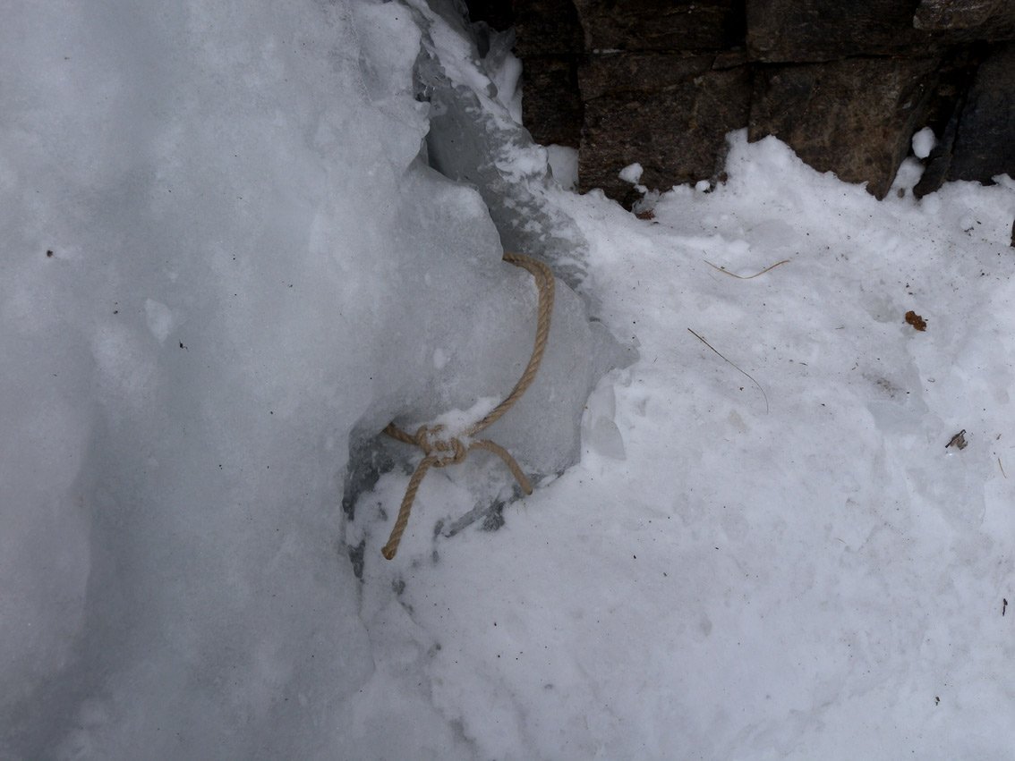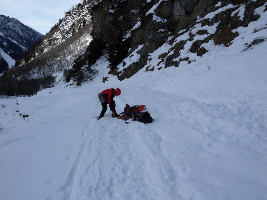 Vom Ausstieg rechts haltend 300 m waagrecht bis in eine steile Rinne (anfangs im Sinne des Abstieges rechts daneben) und durch diese hinunter zur Straße. Alternatives Abseilen über den Eisfall natürlich auch möglich.