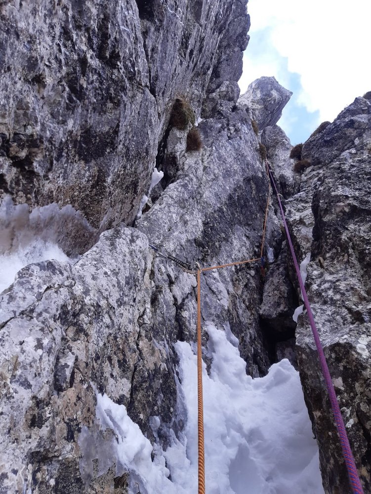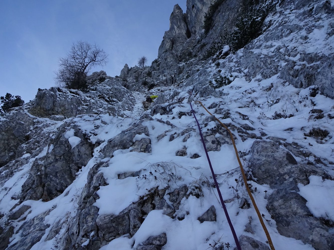 2. SL: 45m; 7 BH; M5+: Vom Stand rechts haltend am Anfang steil dann flach weiter in einem linksbogen in eine Kaminverschneidung. Dieser gerade hinauf folgend, oben nach links aussteigen, um anschließend rechts in Schrofengelände zum Stand zu gelangen. Vorsicht vor Seilreibung.