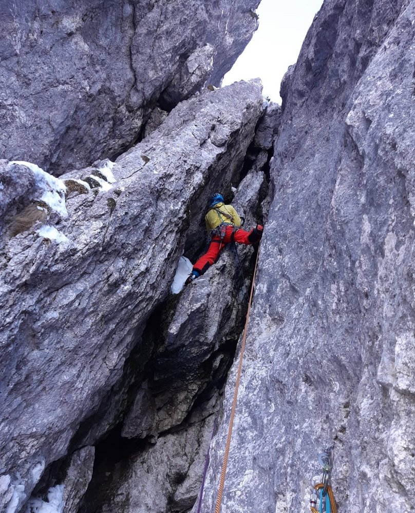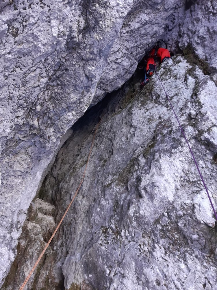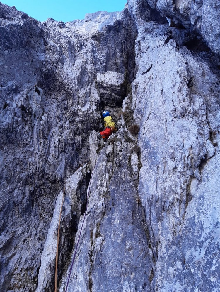 5. SL: 35m; 6BH; M5: Durch den Körperriss in die enge Rinne. An dessen Ende in den rechten Ast der Kaminschlucht.