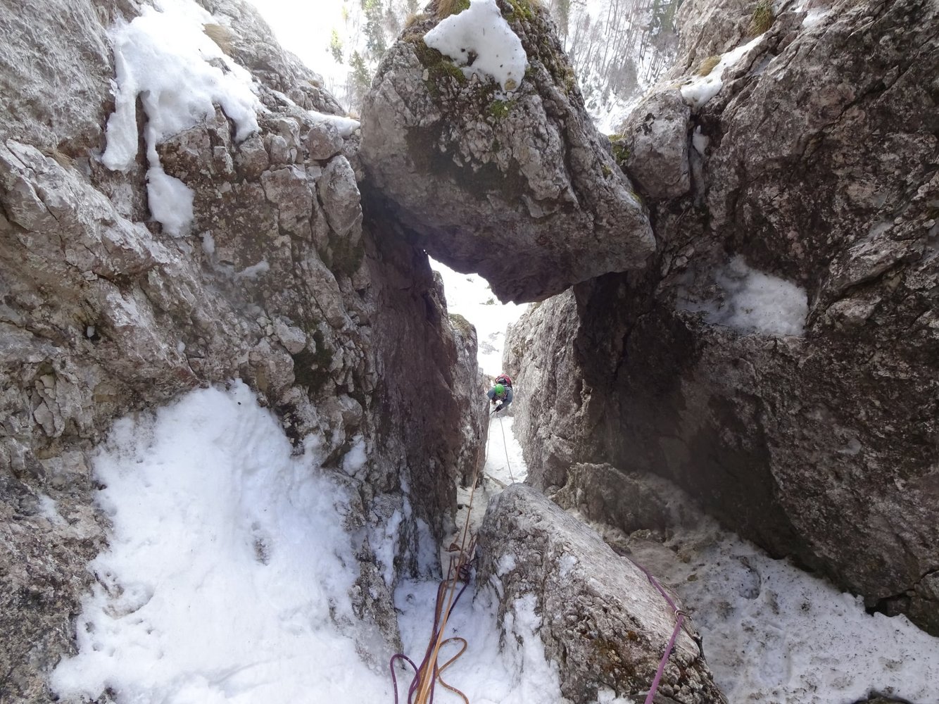 3. SL: 40m; 4 BH; M4: Vom Stand rechts, kurz steil. Anschließend nach links in ein Coloir. An dessen Ende befindet sich der Stand auf der rechten Seite.