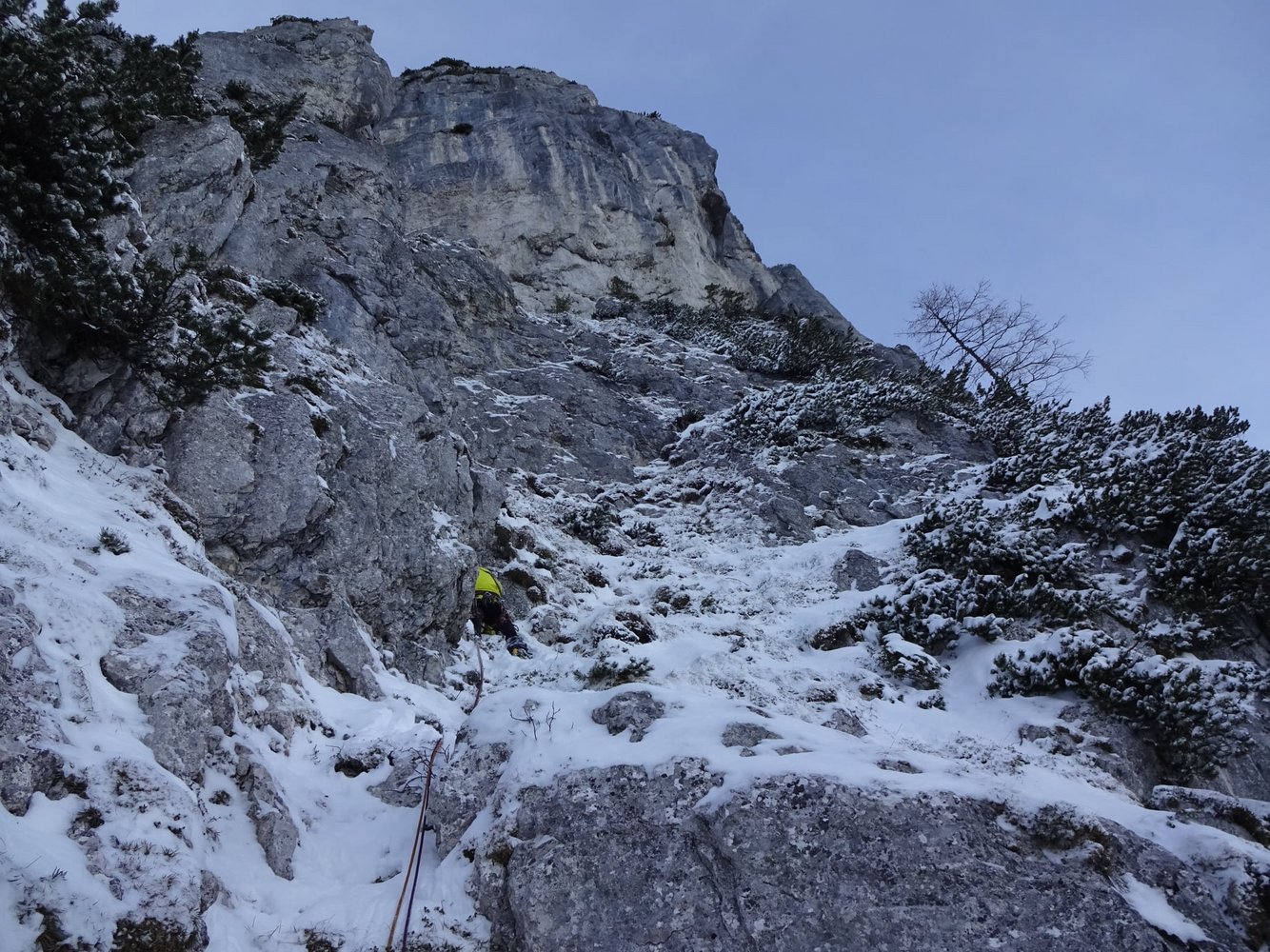 8. SL: 30m; 2 BH; M5: Vom Stand rechts haltend (mit Latschensicherung) anfangs schwerer dann leichter zum Ausstieg. Stand an Latschen (evtl. freigraben).