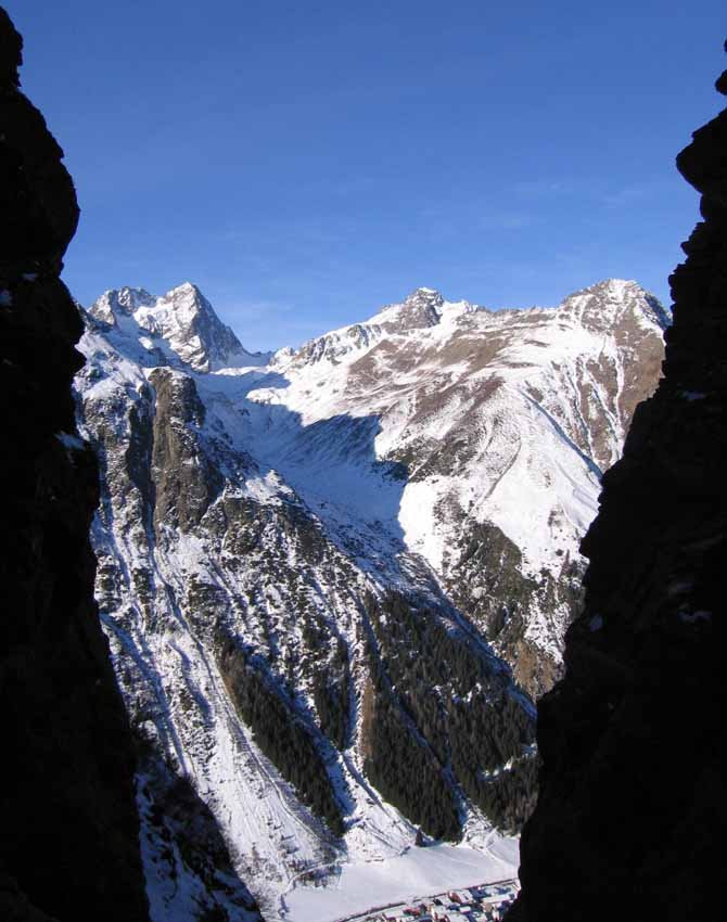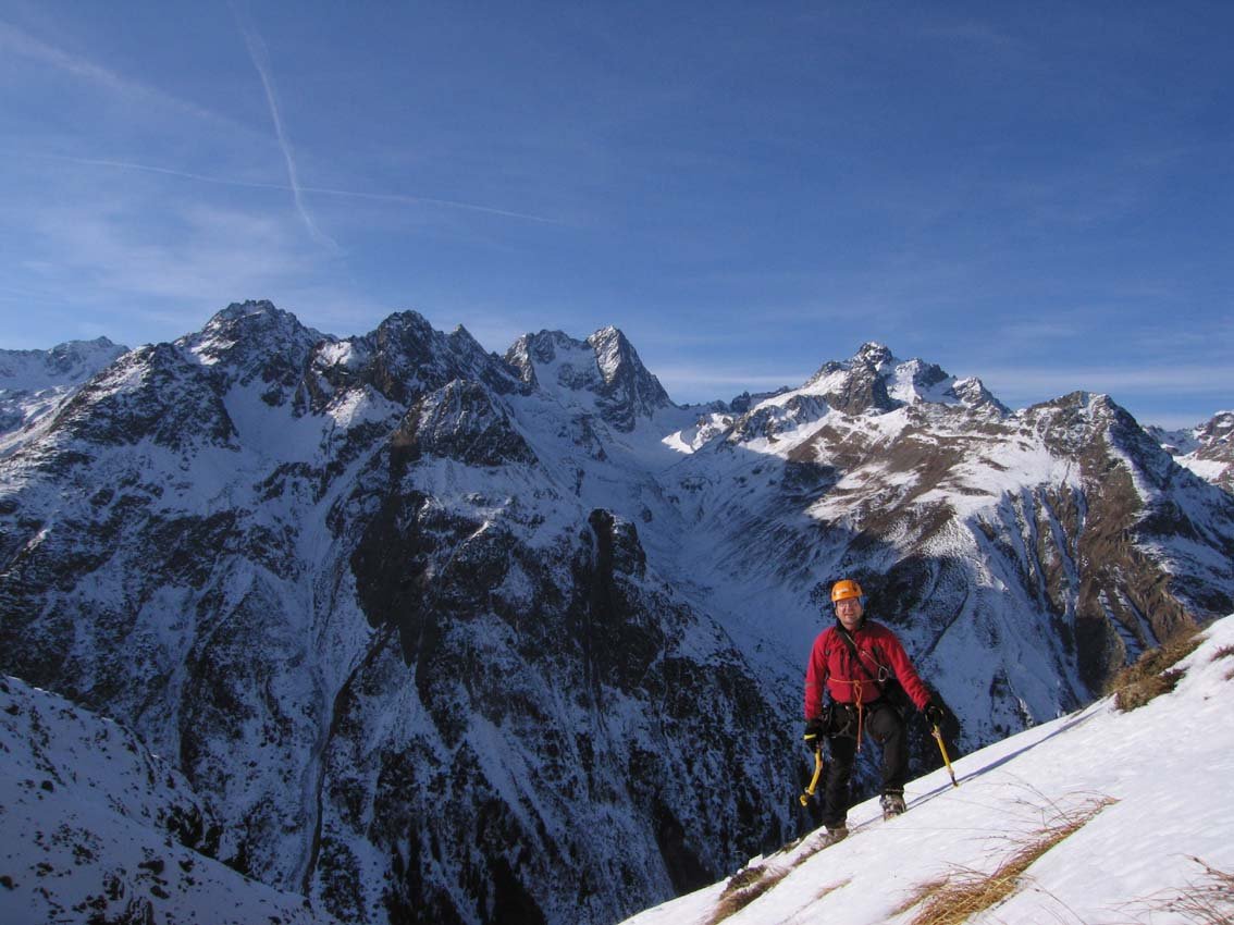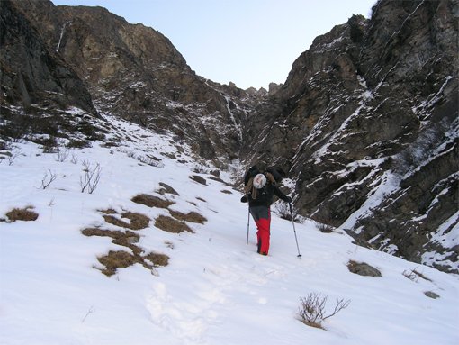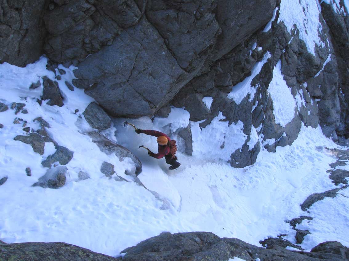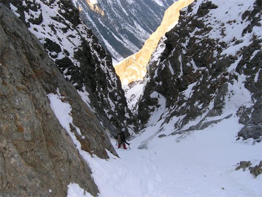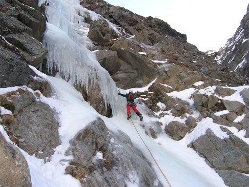 Vom Ausstieg rechts (taleinwärts) waagrecht zurück in die Rinne queren und durch diese absteigen (3 x an Eissanduhren abseilen).