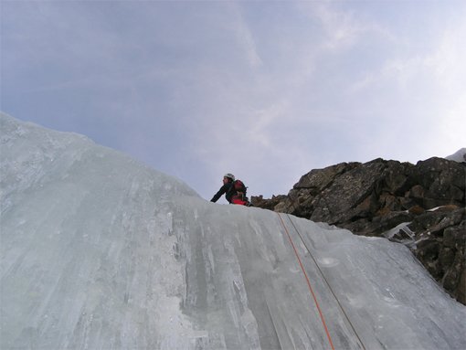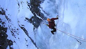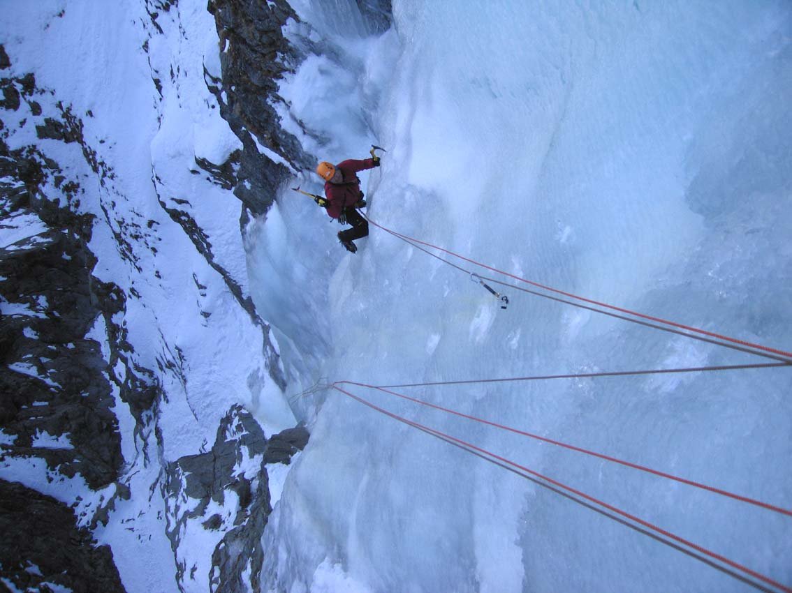 250 m lange Rinne mit Stellen WI 2, dann 2 schwere Seillängen und am Ende wieder leichter.