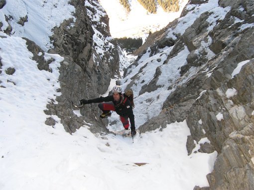 Eisgully mit steilem Mittelteil - wegen der hohen Lawinengefahr nur bei ganz sicheren Verhältnissen machbar (am besten in schneearmen Wintern).