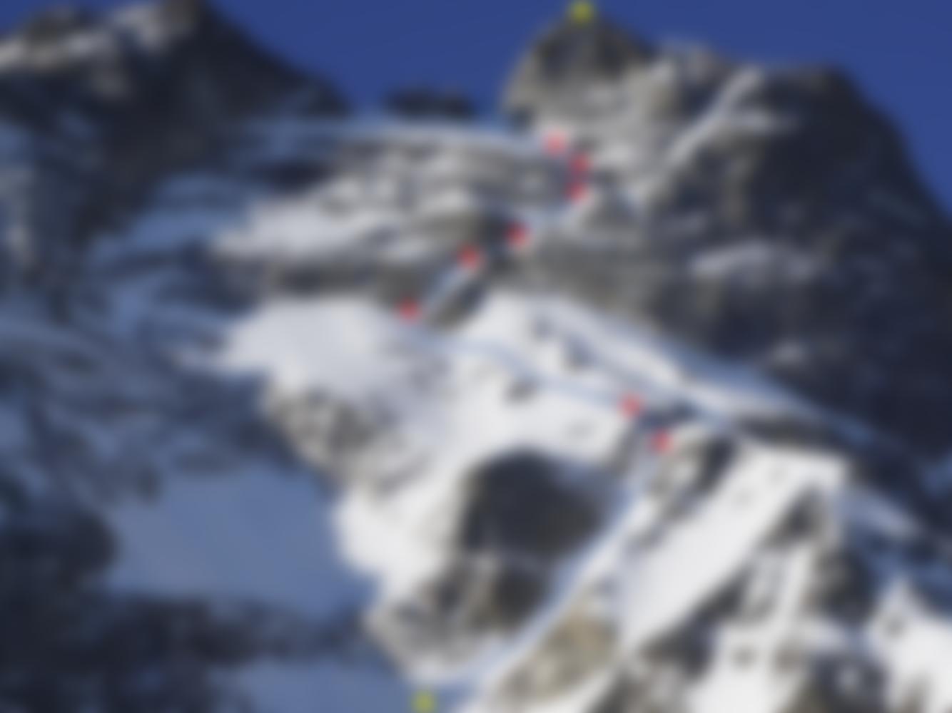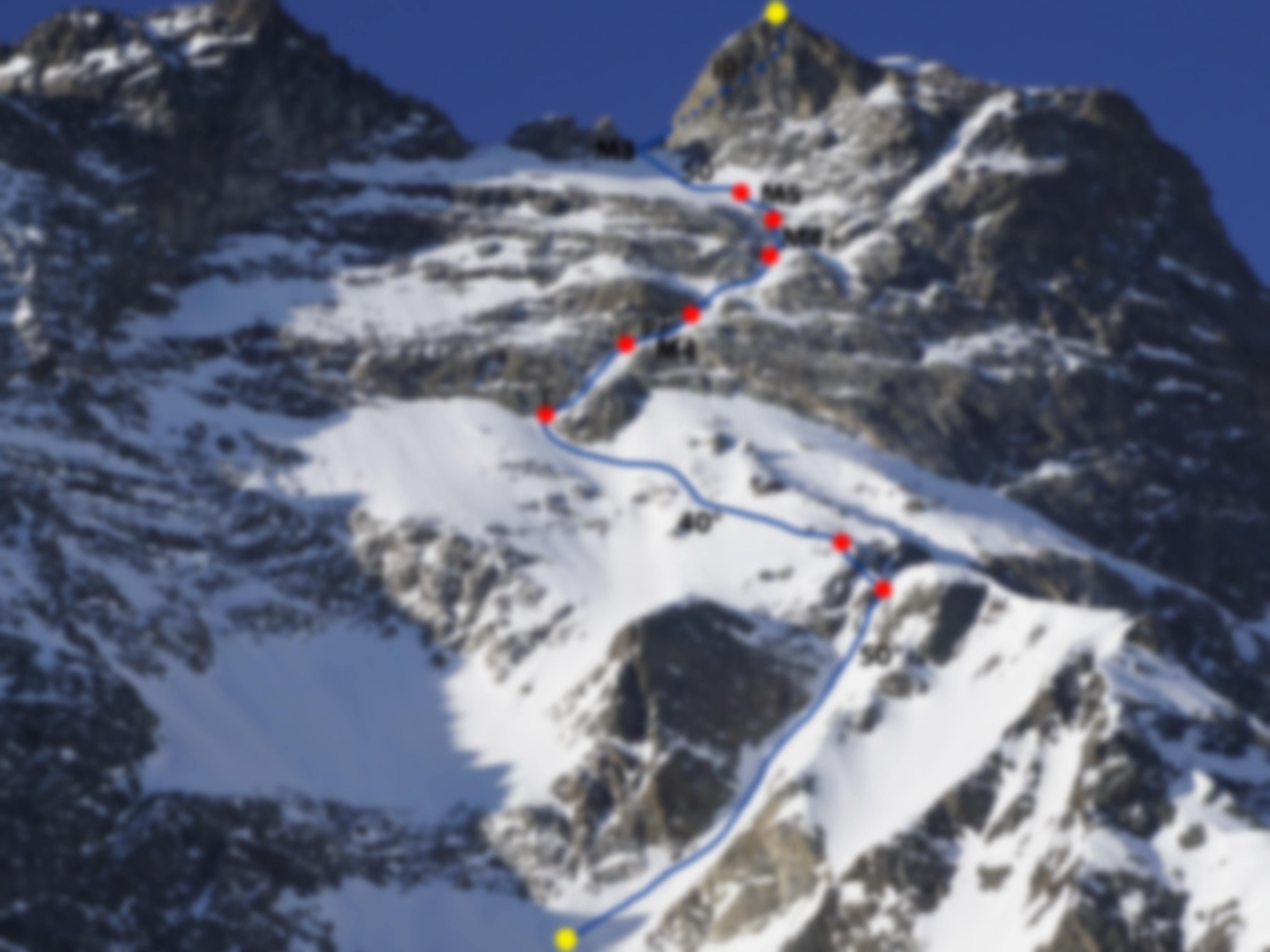 Die klettertechnisch schwierigsten Stellen sind vor dem letzten Schneefeld zu finden. Hier muss mit schlecht abzusichernden, eingeschneiten Felsplatten gerechnet werden. Im Topo wurde an vielen Stellen absichtlich auf die Angabe einer Schwierigkeit verzichtet. Gerade im Mittelteil der Route (Schneeband) sind gute Verhältnisse enorm wichtig, da ansonsten mit lockerem Schotter und Kies gerechnet werden muss.